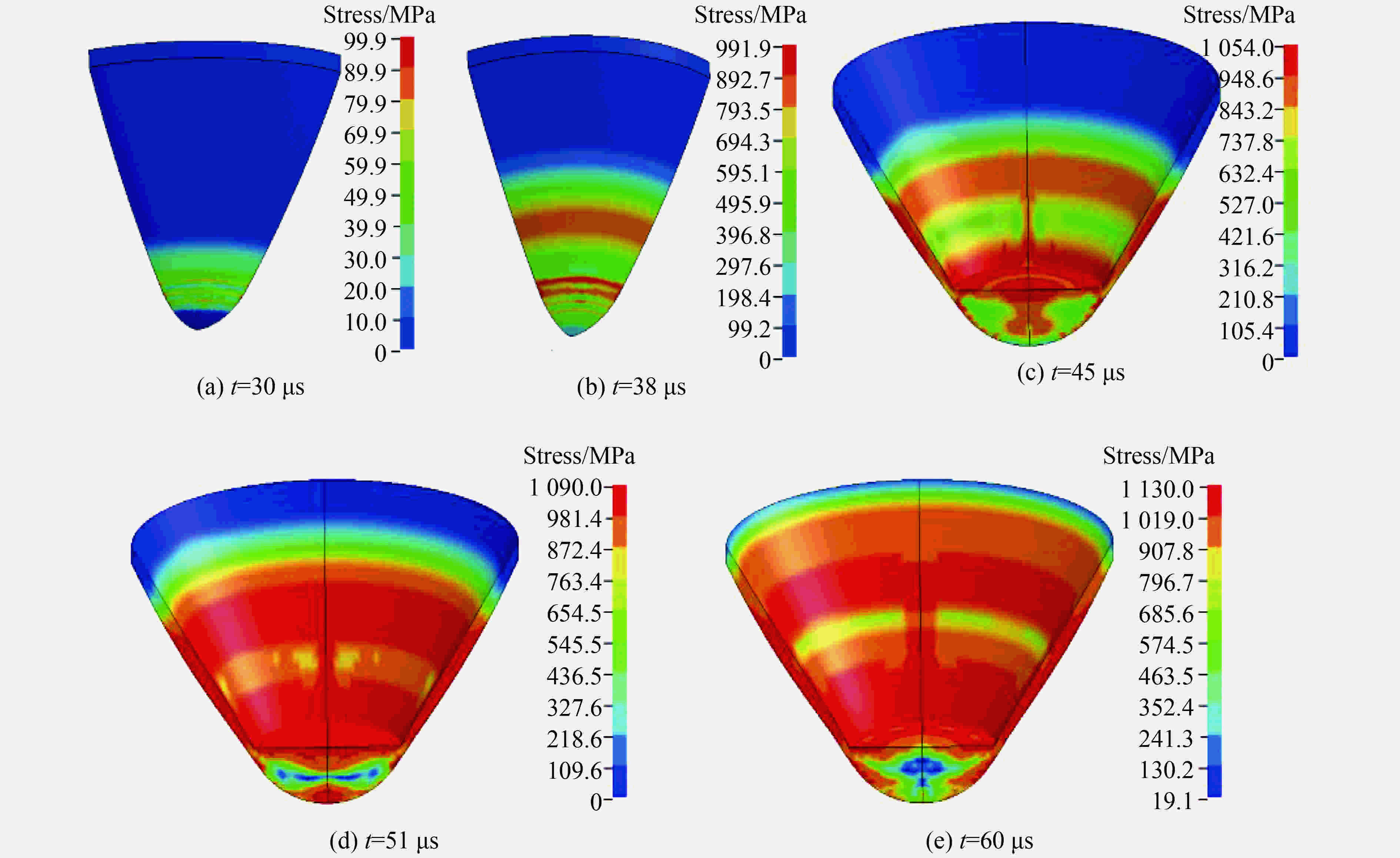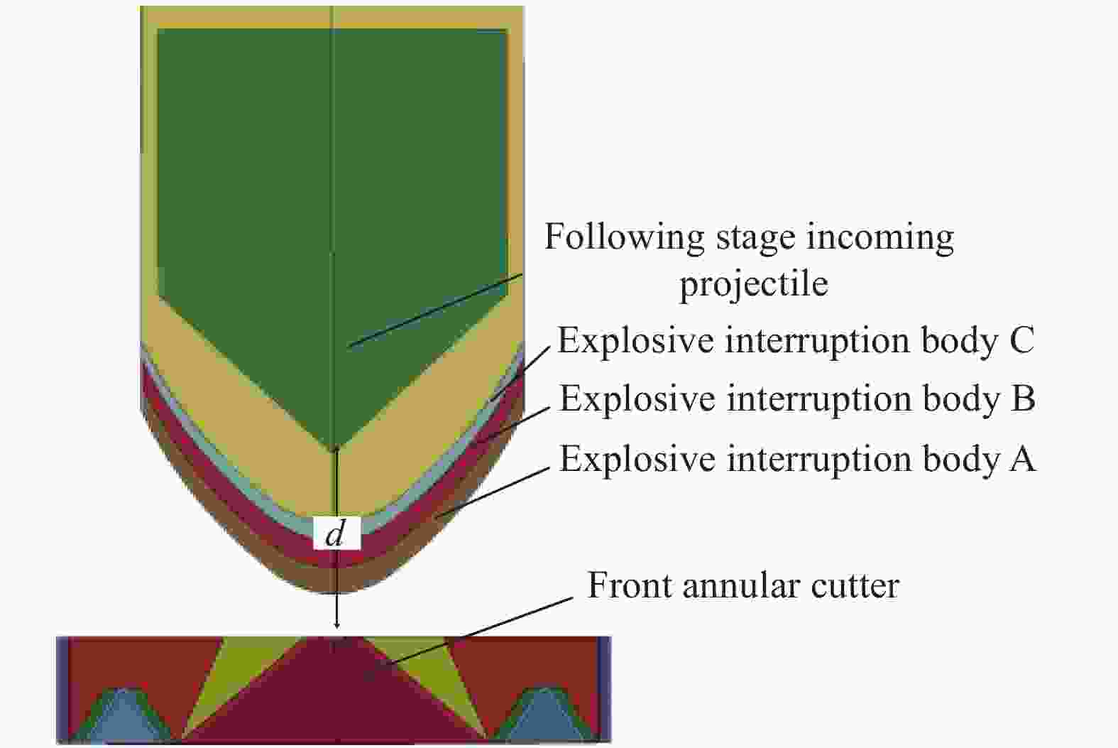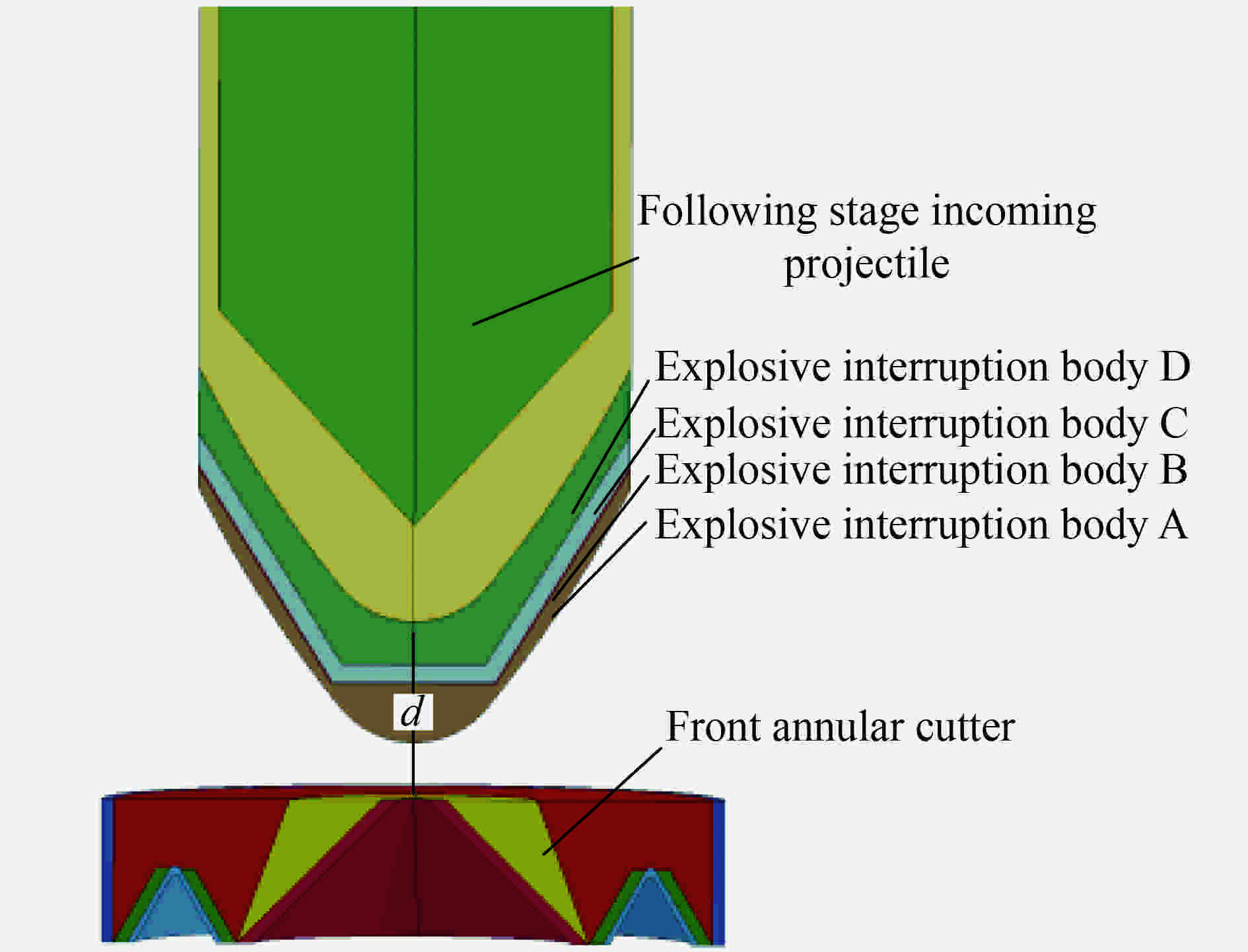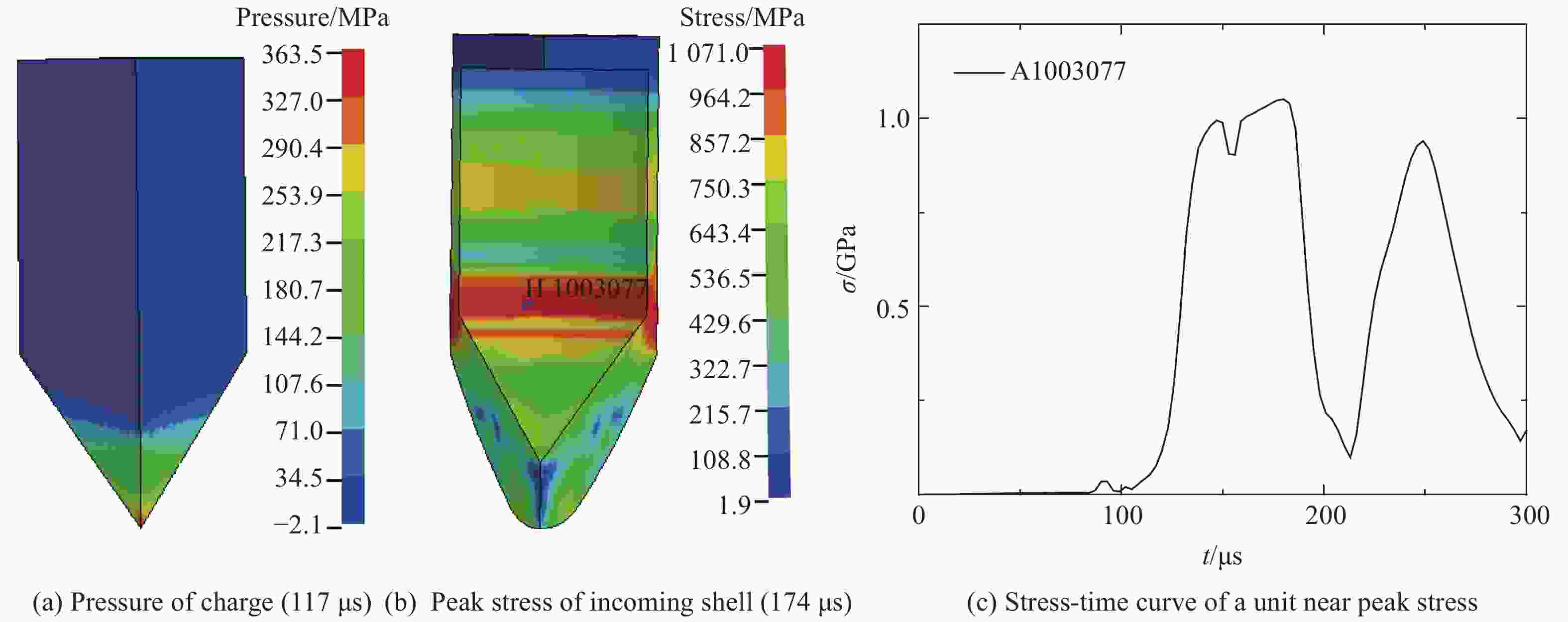 摘要: 为了有效提升串联切割战斗部隔爆结构衰减爆炸冲击波的性能,解决前级聚能装药结构与后级随进弹的匹配及隔爆问题,在前级切割器和后级随进弹之间加装隔爆结构,使用有限元分析软件ANSYS/LS-DYNA建立模型,进行不同组合结构隔爆性能的数值模拟,比较隔爆能力。模拟结果表明:前级装药起爆后,爆炸冲击波首先向后级随进弹头靠里区域汇聚,而不是向弹头尖端区域汇聚,因此可以适当减薄外层金属隔爆介质头部尖端区域;将外层金属由硬质钢改成铝时,后端壳体应力峰值的变化很小,故确定外层金属介质为铝;铝-聚脲的隔爆能力优于铝-泡沫铝结构,最终确定“软”隔爆介质为聚脲。通过调整铝和聚脲层的厚度,确定了最佳隔爆参数,能够满足实际应用。Abstract: In this work we improved the explosion shock wave mitigation capability of the interruption structure in the tandem cutting warhead and matched the front shaped charge with the post-stage projectile and the explosive interruption by installing the explosive interruption structure between the front cutter and the rear following projectile, and established the simulation model using ANSYS/LS-DYNA, a finite element analysis software. We also analyzed the mitigation capabilities of the structures in different combinations and compared their explosive interruption capabilities using numerical simulation. The results showed that the explosion shock wave first converged to the inner region of the projectile, rather than to the tip of the warhead, so that the tip area of the outer metal flameproof medium was thinned properly. When the outer metal turned from hard steel to aluminum, little change was observed in the stress peak value of the rear end shell, suggesting that the outer metal medium was aluminum. Judging by the comparative study, the aluminum polyurea flameproof capability was superior to the aluminum foam-aluminum structure. Finally, the "soft" explosive interruption medium was determined to be polyurea, and the best explosion proof parameters were determined by adjusting the thickness of the aluminum and polyurea layer, which serves the needs of practical applications.