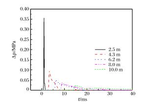 Distance/m Time/ms 1.2 0.752 1.6 1.812 2.0 2.599 2.4 3.009 2.8 3.794 3.2 4.730 表 7 计算超压值与试验超压值对比