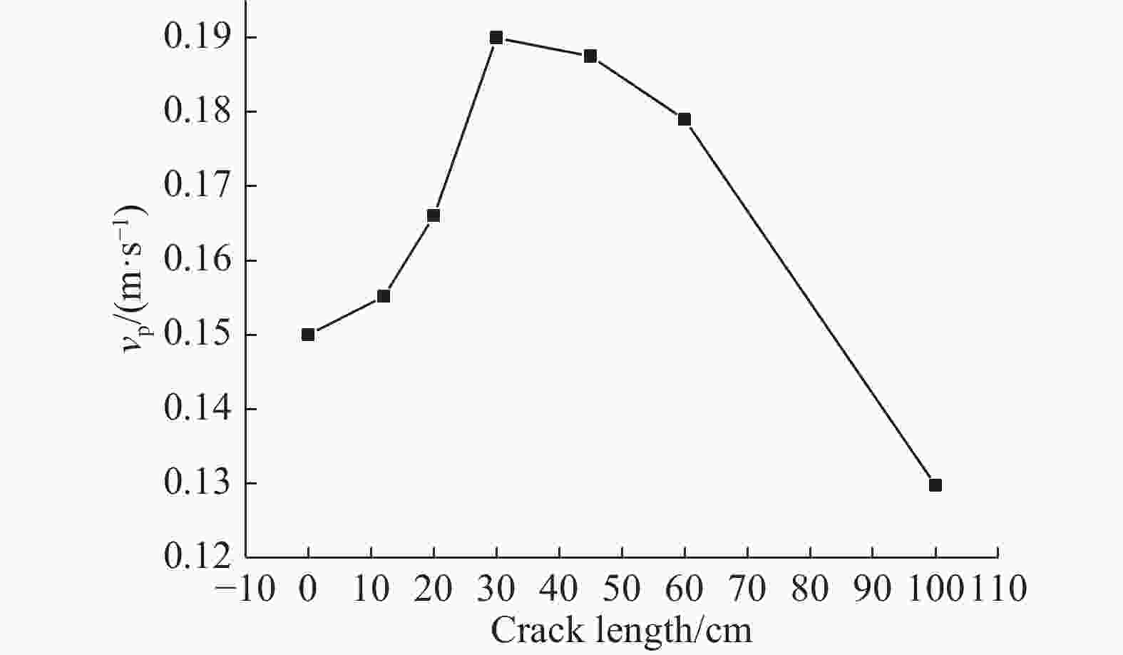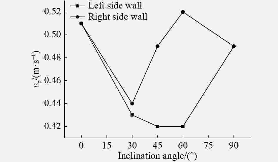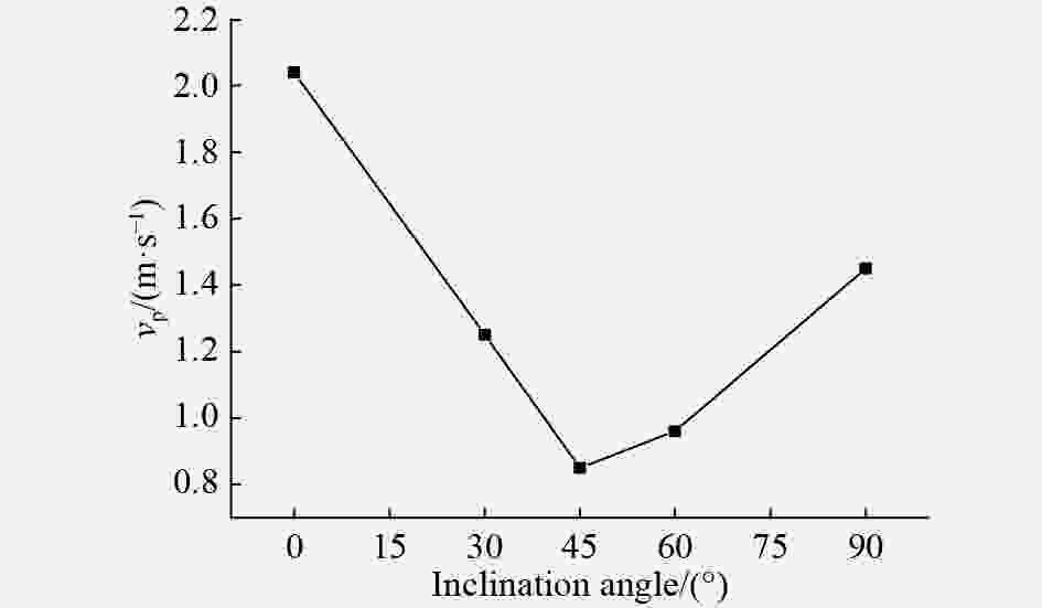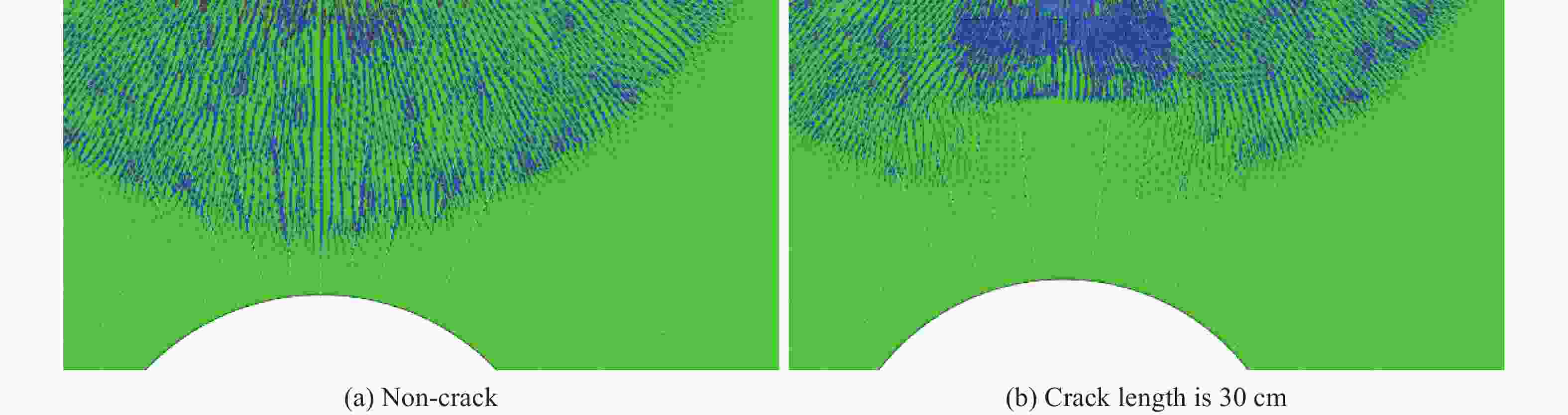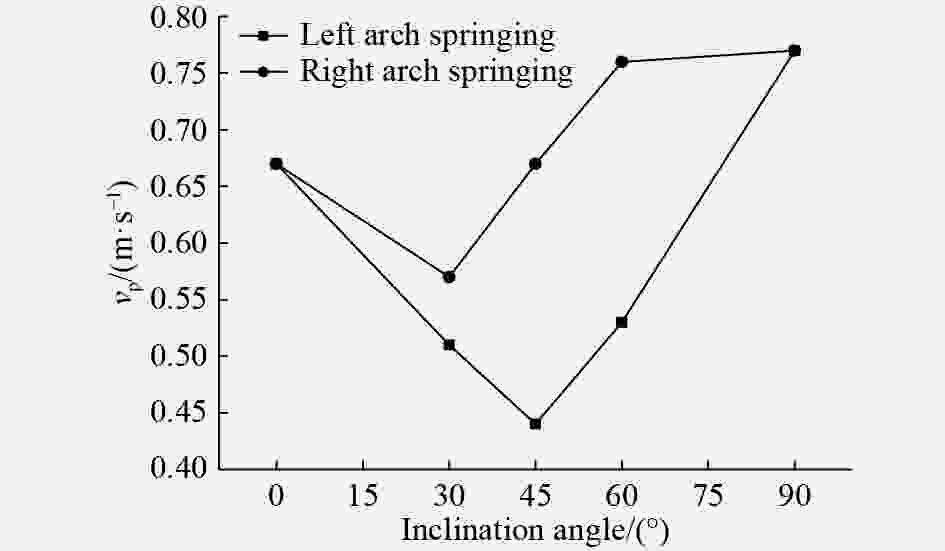 Inclination angle Particle peak vibration velocity/(m·s-1) Vault Left arch springing Right arch springing Left side wall Right side wall Floor Non-crack 1.64 0.88 0.88 0.49 0.49 0.15 0° 2.04 0.67 0.67 0.51 0.51 0.19 30° 1.25 0.51 0.57 0.43 0.44 0.17 45° 0.85 0.44 0.67 0.42 0.49 0.15 60° 0.96 0.53 0.76 0.42 0.52 0.16 90° 1.45 0.77 0.77 0.49 0.49 0.15 -