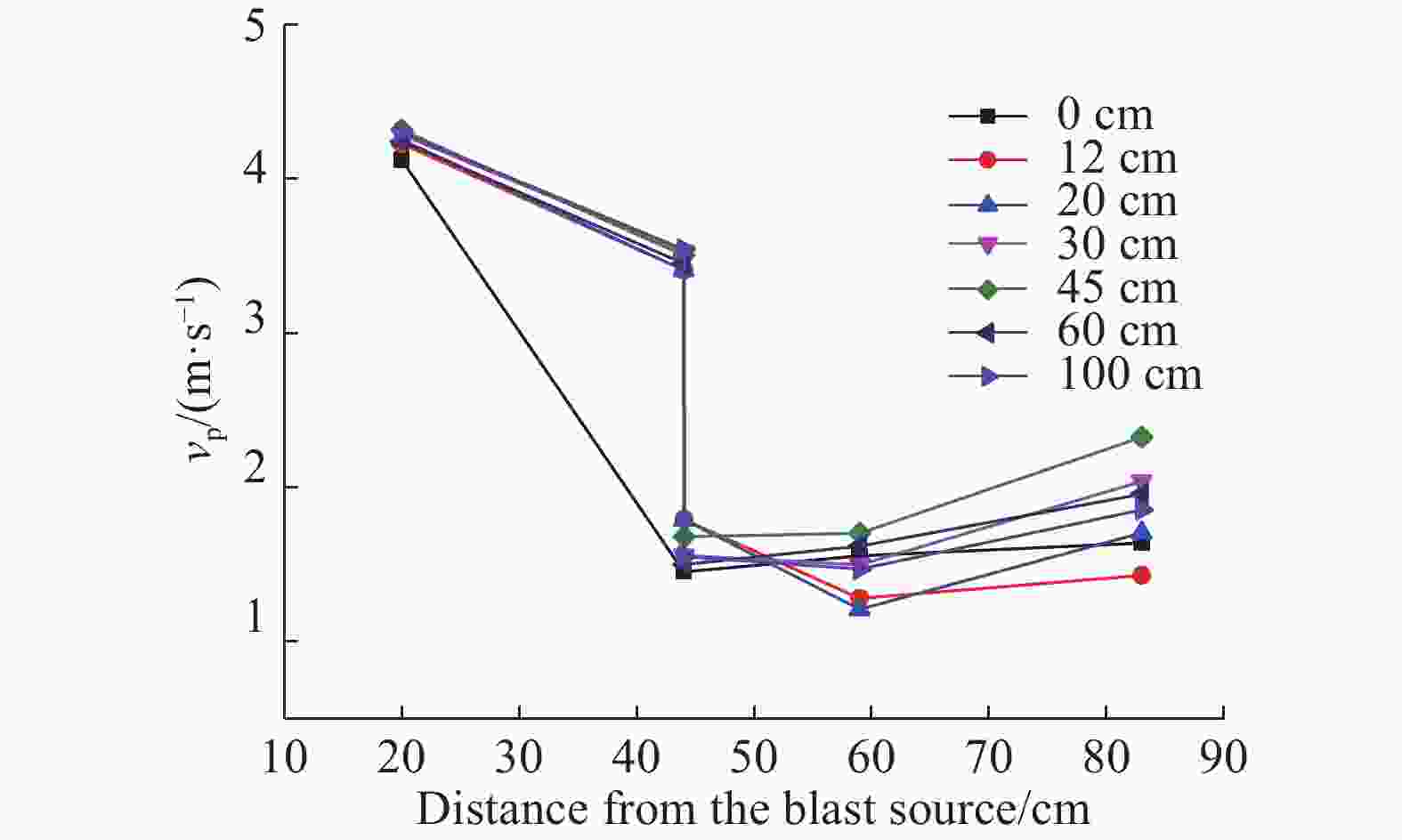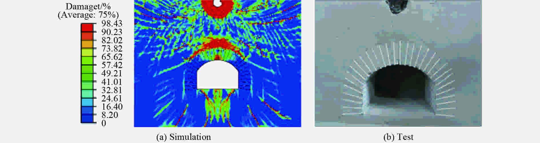 摘要: 基于相似模型试验,利用数值分析方法研究了含裂隙锚固洞室在顶爆作用下质点峰值振速的分布规律,并探讨了裂隙倾角和长度对峰值振速的影响。结果表明:裂隙和洞室表面在迎爆侧存在振速放大效应,洞室两侧和底部振速远小于拱顶;随着裂隙长度的增加,锚固洞室拱顶、拱脚和两帮峰值振速先减小后增加再减小,除了长度较短的情况,裂隙的存在使锚固洞室拱顶的峰值振速增加;随着裂隙向右倾斜的倾角增加,拱脚和两帮的峰值振速出现不对称,洞室右边的拱脚和侧帮峰值振速大于左边;拱顶峰值振速先减小后增加,倾角为45°时拱顶峰值振速最小,相较无裂隙洞室降低了48.2%,有效减弱了结构的动力响应。Abstract: Based on the similar model test, we studied the peak particle vibration velocity (vp) of the crack-containing anchorage caverns under top explosion using numerical analysis method, and discussed the influence of the crack’s inclination angle and length on vp. The results show a vibration velocity-amplification effect on the crack and cavern surface of the blast side, vp of both sides and bottom of the cavern are much smaller than that of the vault. As the crack length increases, vp of the vault, arch springing and side walls of the anchoring cavern first decrease and then increase and decrease again. The existence of the crack amplifies the arch vp of the anchoring cavern except for the short-length crack condition. As the inclination angle of the crack leans to right, vp of the arch springing and the side walls become asymmetrical, vp of the right arch springing (or right side wall) is greater than that of the left side. The vp of the vault first decreases and then increases as the inclination angle increases, its minimum occurs when the inclination angle is 45°, which is 48.2% lower than that of the non-crack cavity, suggesting that the dynamic response of the structure is effectively weakened.