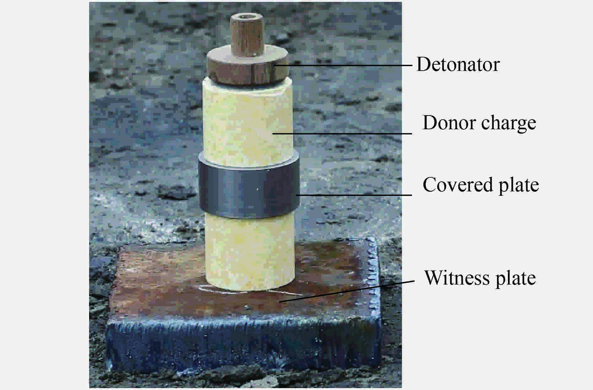 Material ρ0/(g·cm-3) D/(m·s-1) pCJ/GPa A/GPa B/GPa R1 R2 ω E/(109 J·m-3) TNT 1.60 6 812 18.56 370 3.23 4.15 0.95 0.3 7 Material ρ0/(g·cm-3) G/GPa A1/GPa B1/GPa C1 n m Tm/K Tr/K 45 steel 7.85 82.3 0.507 0.320 0.280 0.064 1.06 1 765 298 Q235 steel 7.83 80.0 0.235 0.250 0.022 1.000 0.36 1 793 294 I/μs–1 G1/( Pa–3·s–1) G2/( Pa–3·s–1) a b c d e g x y z 8×108 4.20×10–25 2.60×10–25 0.111 0.667 0.667 0.667 0.333 1 6 3 3 表 3 屏蔽装药冲击引爆试验结果