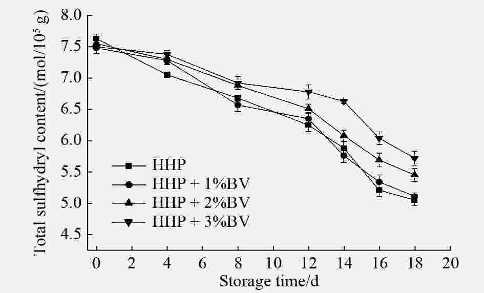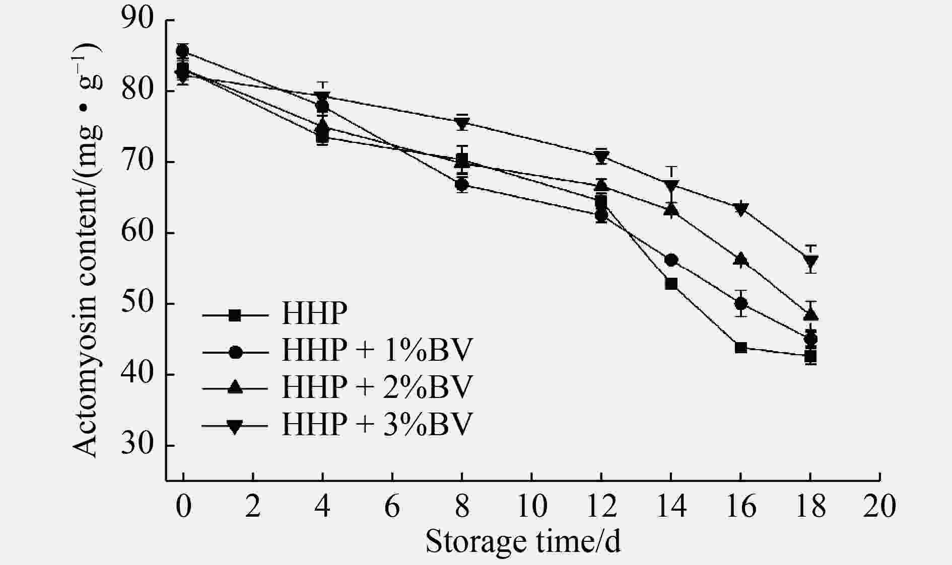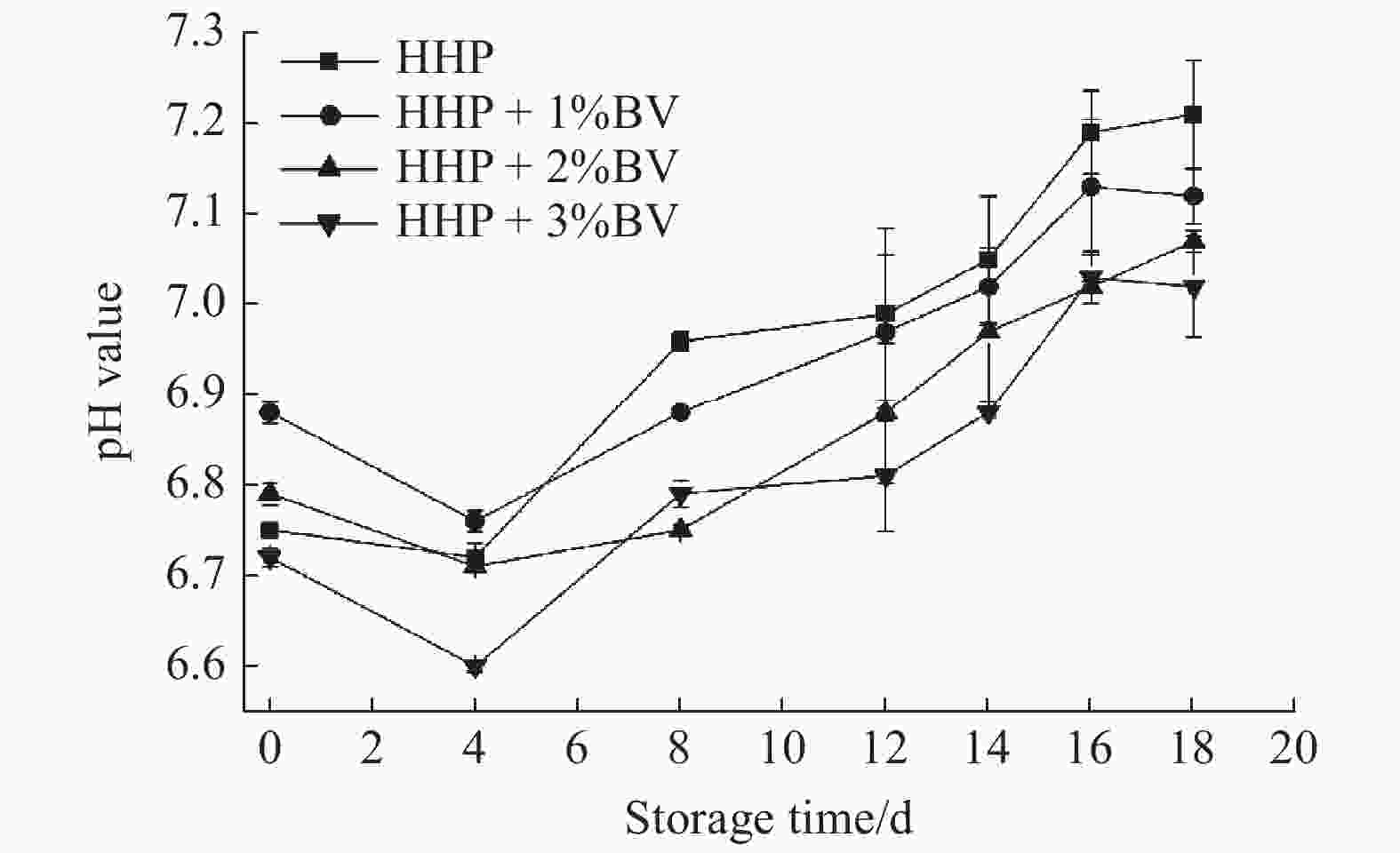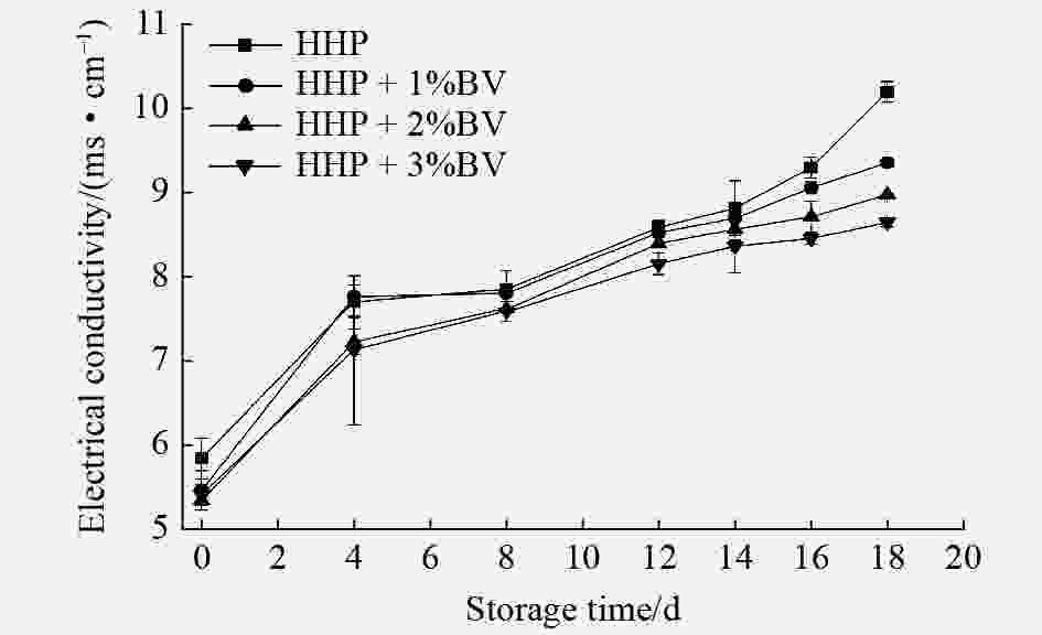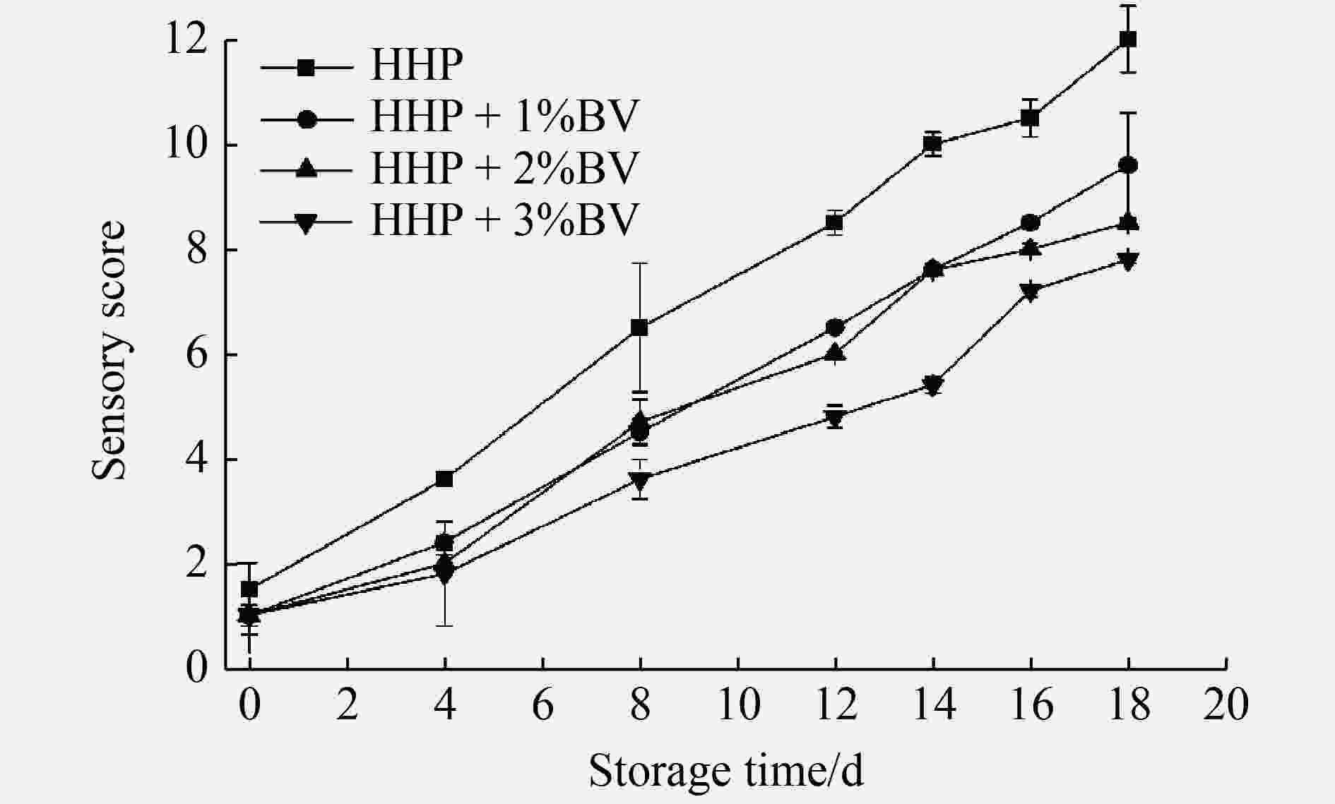 摘要: 为分析超高压结合竹醋液处理对冷藏鲈鱼片品质变化与蛋白特性的影响,将鲈鱼片分别用0%、1%、2%和3%竹醋液浸渍后,进行250 MPa、9 min超高压处理,随后置于4 ℃贮藏。分别在第0、4、8、12、14、16、18 d对各组样品进行理化指标(色差、pH值、电导率、TVB-N值)、感官及蛋白质特性(肌动球蛋白含量、总巯基含量、TCA可溶性寡肽溶出量)分析,综合评价不同处理方式对冷藏鲈鱼片品质与蛋白特性的影响。分析结果表明:超高压结合3%竹醋液处理后,鲈鱼片的TVB-N值在贮藏末期(18 d)达(31.88±1.33) mgN/100 g,明显低于超高压冷藏对照组样品(44.77±1.89) mgN/100 g;此外,该处理方式还能延缓样品pH值变化和电导率的升高;蛋白特性指标显示该处理同时显著减缓了样品中蛋白质的降解变性,并维持其良好特性。因此,超高压结合竹醋液处理能够明显改善鲈鱼片的综合品质并维持其蛋白特性,其中超高压结合3%竹醋液处理的效果最优,能使冷藏鲈鱼片的货架期至少延长4 d。Abstract: In this study we aimed to study the effects of high hydrostatic pressure (HHP) with bamboo vinegar (BV) on enhancing the quality and improving the protein properties of perch (Lateolabrax japonicus) fillets over refrigerated storage. We treated fillet samples stored under refrigerated conditions at 4 °C using HHP (250 MPa, 9 min) along with 0, 1%, 2%, 3% BV respectively. We calibrated the physicochemical qualities (color difference, pH value, electrical conductivity and total volatile basic nitrogen (TVB-N) value) and examined the changes that occurred in terms of the sensory impressions and protein properties (actin globulin content, total sulfhydryl content, TCA soluble oligopeptide elution) of the samples on the 1st, 4th, 8th, 12th, 14th, 16th, and 18th day respectively during the storage time. The results showed that the samples exhibited obvious quality improvement: the TVB-N value of the samples treated by HHP with 3% BV was (31.88±1.33) mgN/100 g on 18th day, significantly lower than that of CK group ((44.77±1.89) mgN/100 g). In addition, the treatment also reduced the increase of the pH value and electrical conductivity, thereby significantly slowing down the protein degradation and maintaining its good characteristics. Finally, the shelf life of the perch fillets thus treated in cold storage was prolonged by four days.
