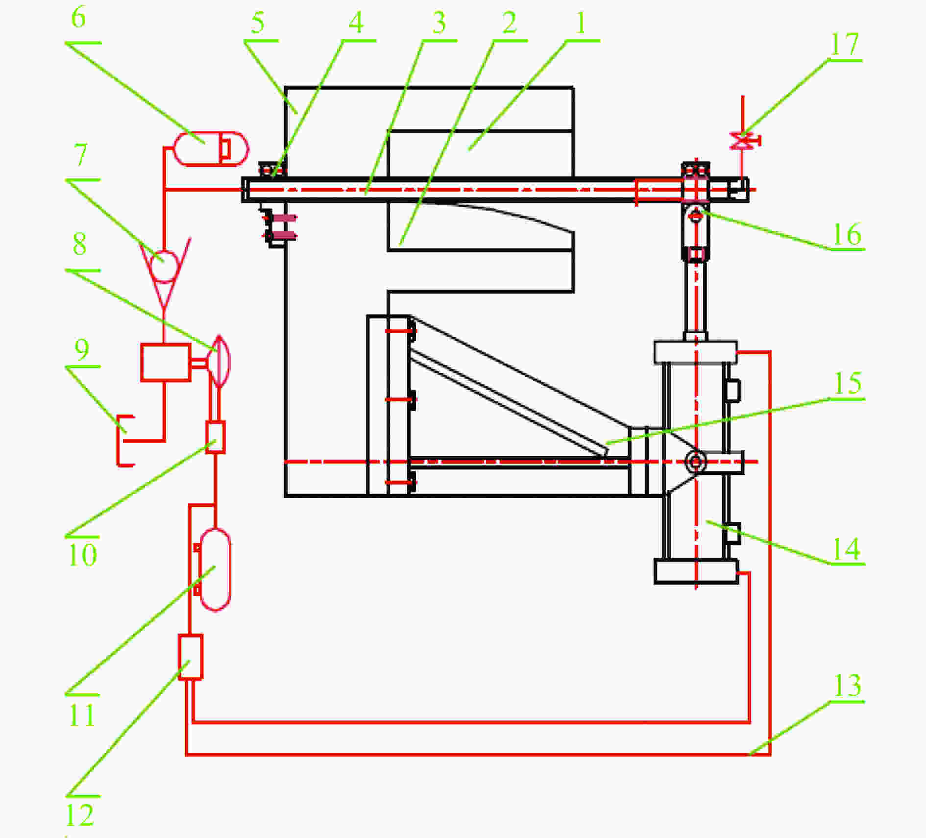 1. Straight mode; 2. Flexing mode; 3. Sample; 4. Fixtures; 5. Base; 6. Accumulator; 7. Check valve; 8. Supercharger; 9. Liquid pool; 10. Air valve; 11. Micro air compressor; 12. Valve; 13. Connecting pipe; 14. Cylinder;15. Support; 16. Active connector; 17. Pressure relief valve