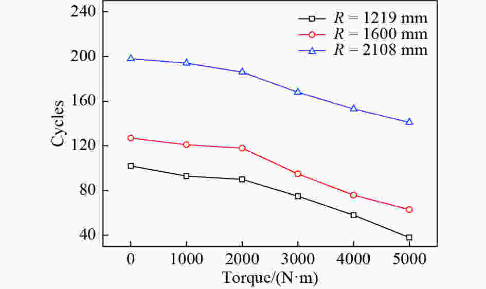 Torque/(N·m) Fatigue life Torque/(N·m) Fatigue life 0 MPa 30 MPa 60 MPa 0 MPa 30 MPa 60 MPa 1000 >107 >107 >107 7300 8650 352 4000 >107 >107 >107 7400 2090 280 5500 >107 >107 >107 7420 745 234 5800 >107 ≥107 ≥107 7450 349 196 6000 >107 1331 111 7480 238 145 6200 >107 856 38 7500 179 122 6400 ≥107 623 1 7700 18 6800 36 890 408 -