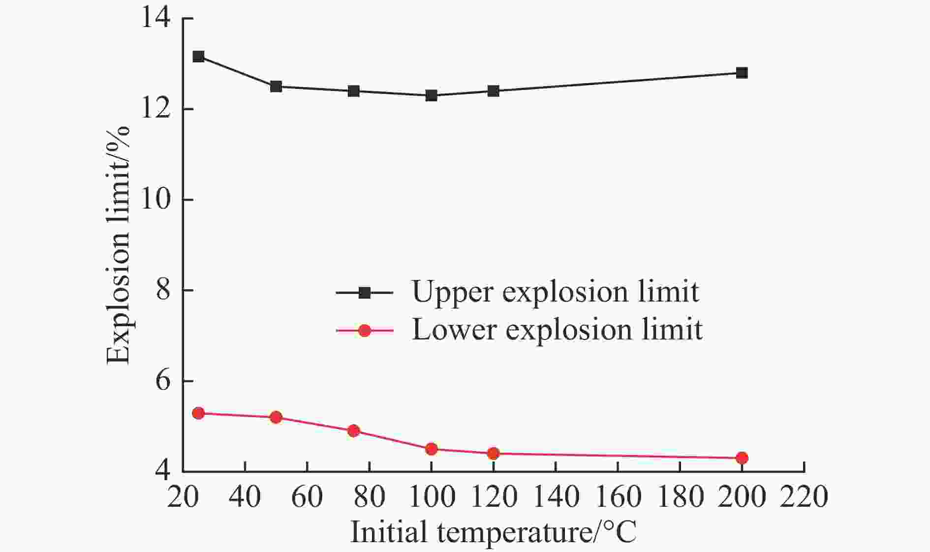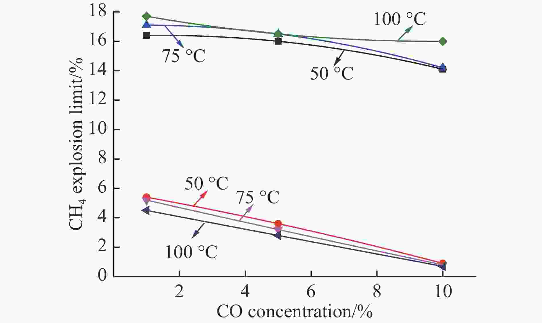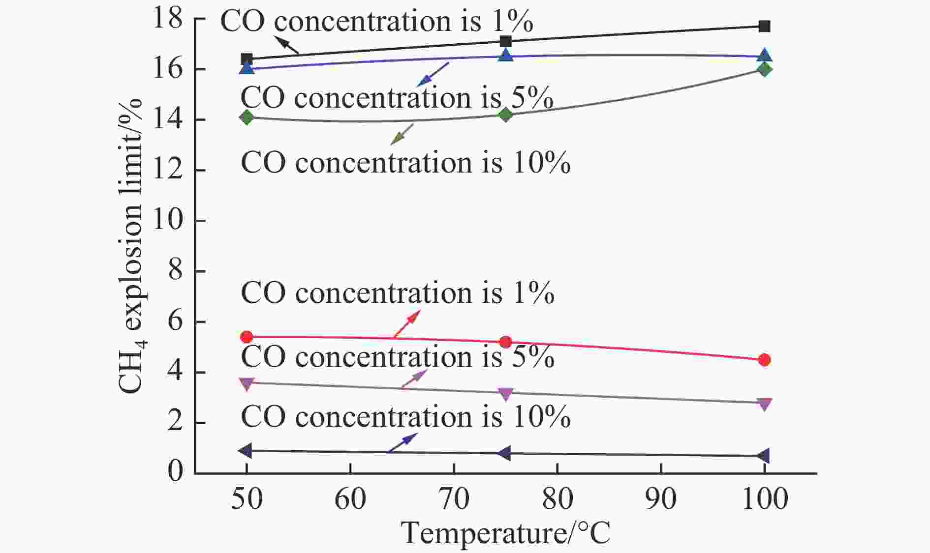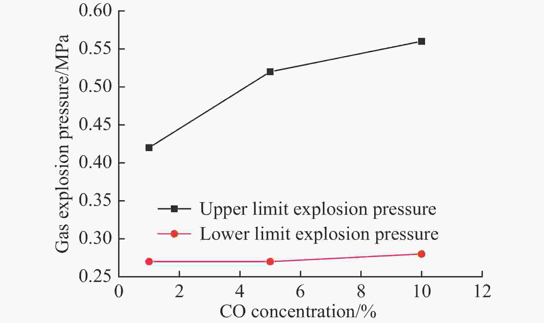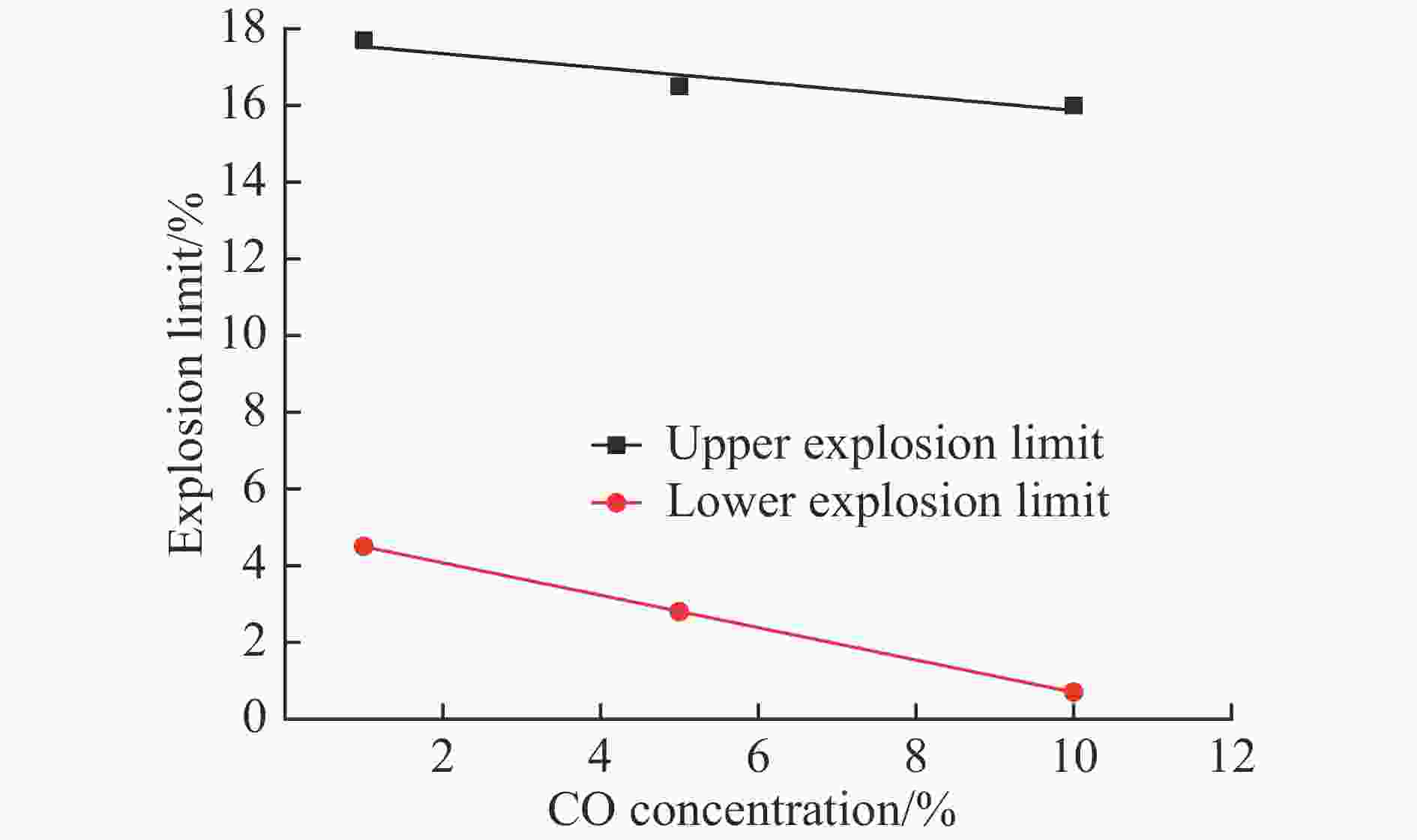 Temperature/℃ UEL/% LEL/% UEL pressure/MPa LEL pressure/MPa 25 13.16 5.29 0.62 0.100 50 12.50 5.20 0.58 0.081 75 12.40 4.90 0.56 0.073 100 12.30 4.50 0.56 0.073 120 12.40 4.40 0.52 0.065 200 12.80 4.30 0.45 0.052 表 3 不同CO浓度时瓦斯爆炸极限与爆炸压力(温度100 °C)