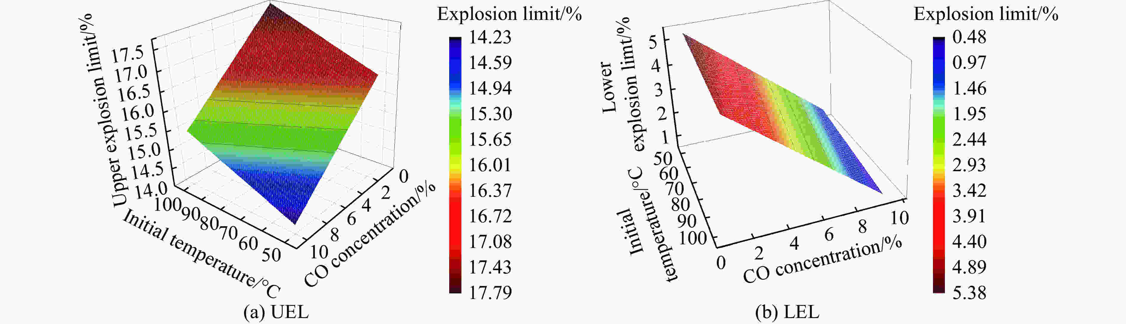 CO concentration/% UEL/% LEL/% UEL pressure/MPa LEL pressure/MPa 1 17.7 4.5 0.42 0.27 5 16.5 2.8 0.52 0.27 10 16.0 0.7 0.56 0.28 表 4 温度与CO浓度耦合条件下拟合函数各参数
