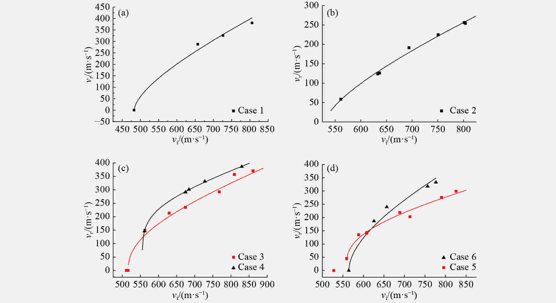 Case Target vi/(m·s–1) vr/(m·s–1) Case Target vi/(m·s–1) vr/(m·s–1) 1 4.0 mm S 657.132 287.697 4 4 mm PU+4 mm S 674.603 291.320 726.341 325.858 684.105 300.965 805.802 380.740 727.896 331.513 2 4.9 mm S 561.149 58.816 829.876 386.320 633.029 123.925 5 4 mm S+8 mm PU 514.000 0 636.623 126.146 528.032 0 693.878 191.269 559.303 45.332 750.718 224.830 588.337 134.878 801.509 256.178 607.577 140.267 803.743 254.149 608.664 143.430 3 4 mm S+4 mm PU 511.355 0 688.817 218.776 516.010 0 713.386 202.670 562.262 148.966 790.514 275.192 629.513 213.340 825.644 298.980 674.469 235.001 6 8 mm PU+4 mm S 564.503 0 767.494 292.222 625.805 186.506 809.331 357.143 657.005 239.808 860.977 370.330 756.396 317.757 4 4 mm PU+4 mm S 561.327 146.199 776.610 332.811 Note: Steel and polyurea are represented by S and PU respectively. 表 4 靶板弹道极限及模型参数