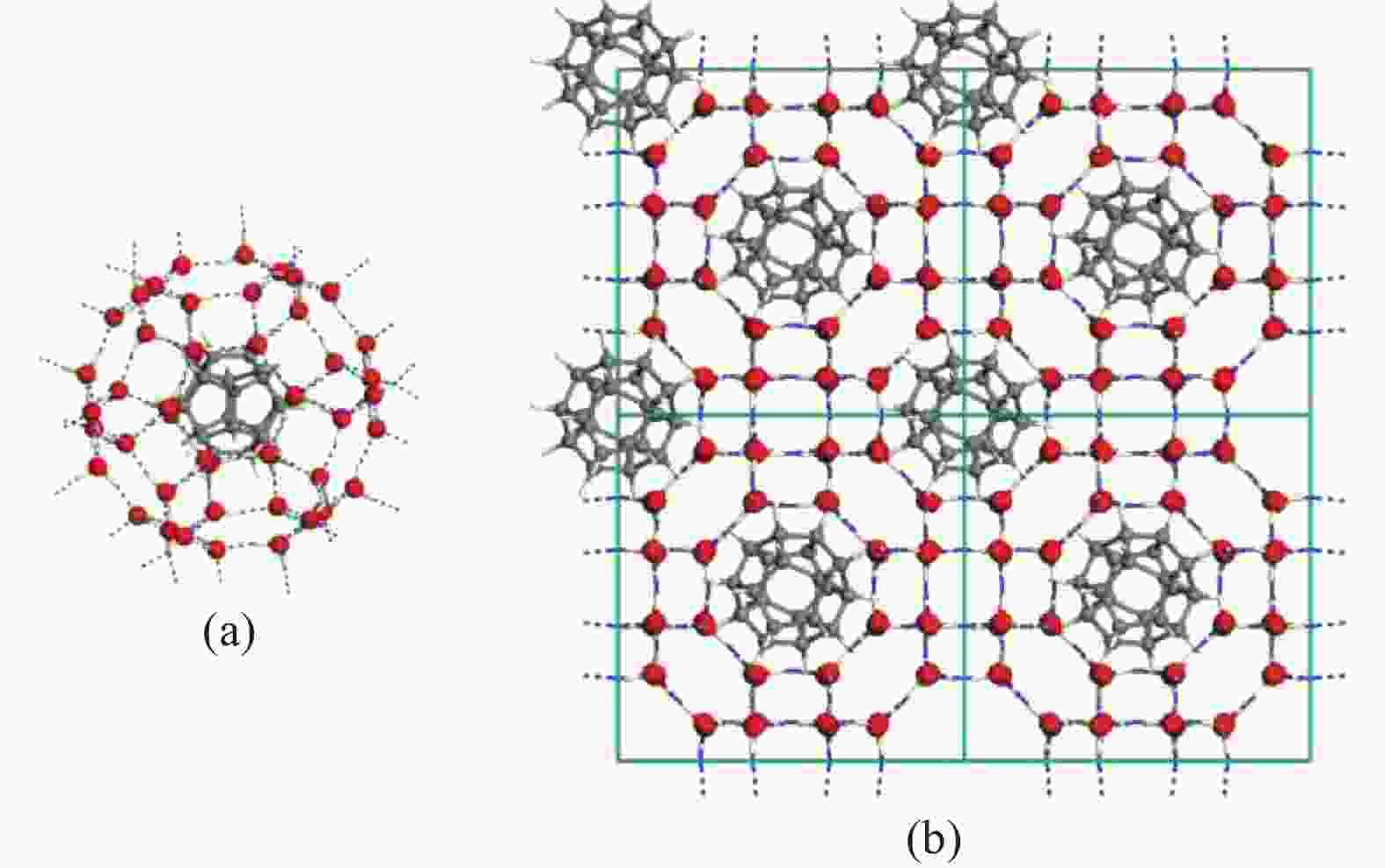 图 10 (a) C20H20分子封装在8668412水笼子中的结构示意;(b) 每个大笼子均被一个C20H20分子占据时s-III笼形冰的结构示意(显示的是2×2的超胞)