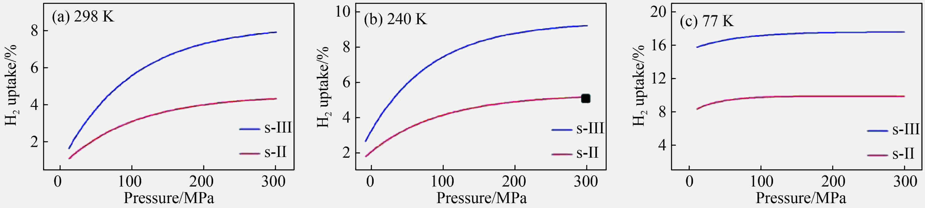 图 11 在温度分别为77、240和298 K时,s-III和s-II笼形冰相在不同氢压下对氢气的吸附函数曲线 (中间图形中的黑色方框表示在温度为240 K、压强为300 MPa条件下获取的实验值[48-49])