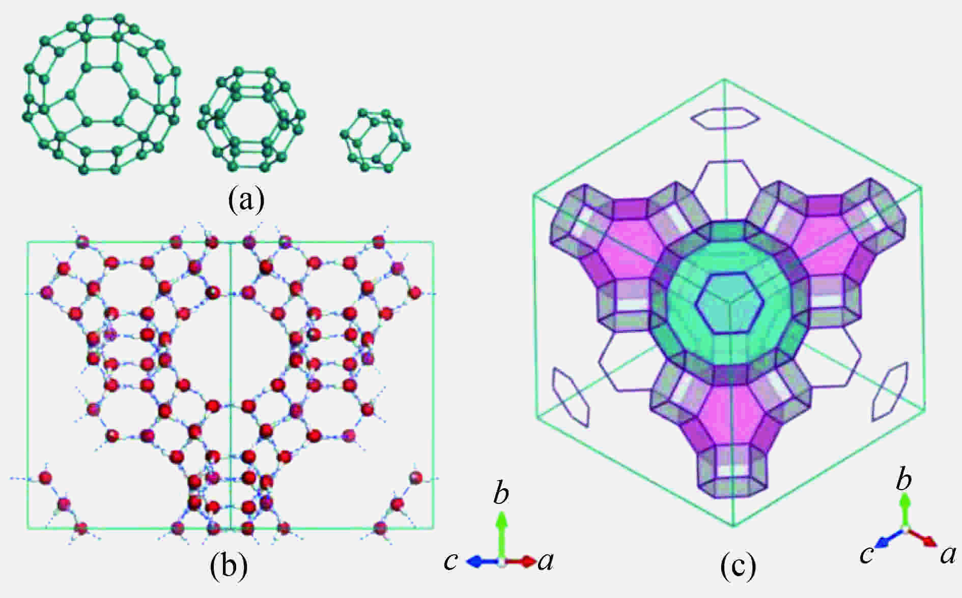 Figure 12. Crystalline structure of the s-IV ice clathrate: (a) Three types of cavities (only oxygen frameworks are shown), from left to right they are large cavity—48-member 12464418with T symmetry, intermediate cavity—24-member 6646 with T symmetry, and small cavity—12-member 6246 with S6 symmetry, respectively; (b) and (c) are the cubic unit cell of the s-IV ice clathrate (The hydrogen-bonding network is shown with blue dash line, red for oxygen, white for hydrogen.)