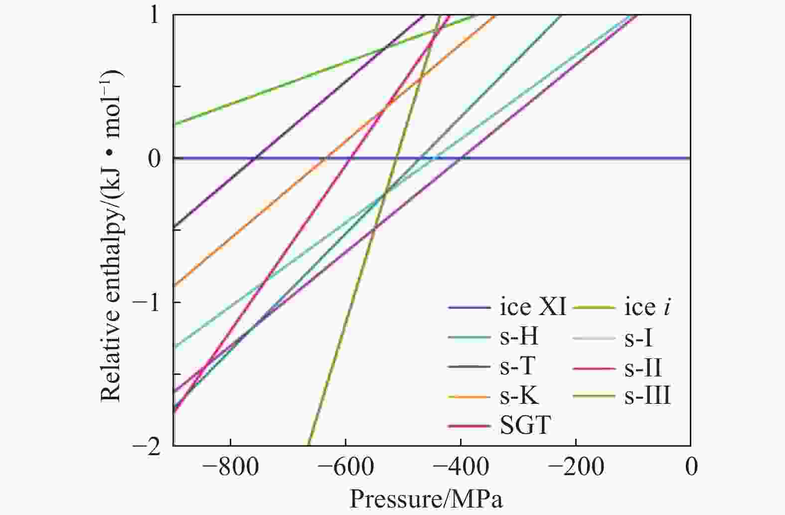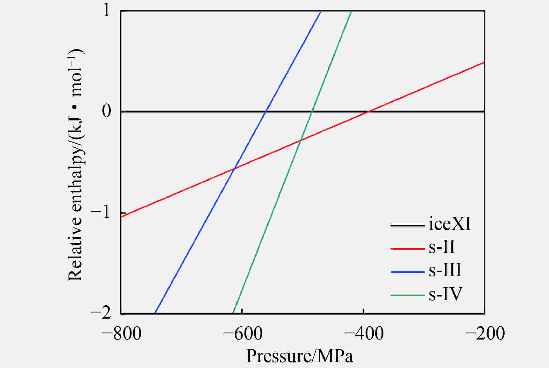 Phase Zcell Vcell/Å3 dO-O/Å ρ/(g·cm-3) Elatt/(kJ·mol-1) ice XI 8 266 (257[17]) 2.785 (2.735[17]) 0.900 (0.930[17]) 62.84 (58.86[74]) ice i 8 280 2.785 0.855 61.31 s-I 46 1 692 2.765 0.813 61.38 s-K 80 2 962 2.765 0.808 60.76 s-II 136 5 059 (5 022[22]) 2.865(2.751[22]) 0.804 (0.81[22]) 61.37 s-T 12 453 2.795 0.792 60.23 s-H 34 1 325 2.785 0.768 60.79 SGT 64 2 650 2.765 0.722 59.27 s-III 48 2 423 2.765 0.593 55.77 表 2 通过vdW-DF2/DFT计算得到的ice XI、s-II、s-III和s-IV冰相元胞内的分子数目(Zcell)、元胞的平衡体积(Vcell)、平均O-O距离(dO-O)、平均氢键键长(dO···H)、密度(ρ)、平均到每个水分子上的晶格结合能(Elatt)(括号内的数据是实验值)