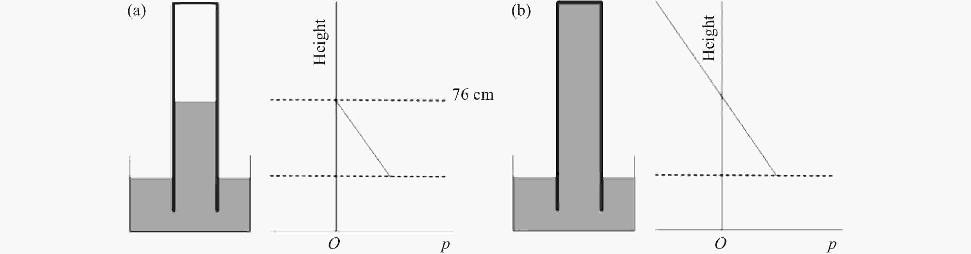 图 2 证实一个大气压存在(a)和Huygens证实负压存在的实验示意(b)(76 cm的水银柱以上表示负压)[39]