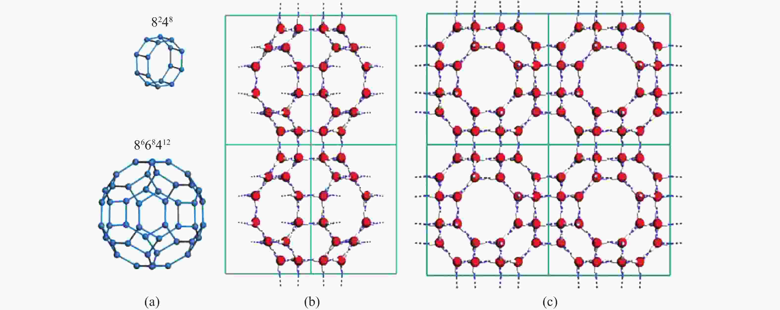 图 5 s-III笼形冰的结构示意:(a) 组成s-III相的两种水笼子(下面是由48个水分子形成的8668412笼子, 上面是由16个水分子形成的8248笼子;只显示了氧原子骨架), (b)和(c) 分别是1×2超胞和2×2超胞(蓝色虚线表示氢键,红色球表示氧原子,白色棍棒表示氢原子)