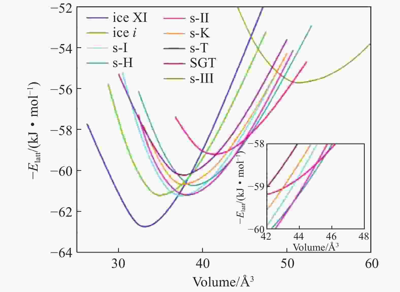 图 7 ice XI、ice i、s-K、s-I、s-II、s-H、s-III、SGT和s-T冰相的晶格结合能(平均到每个分子上)随体积变化的函数曲线(插图是42~48 Å3体积区间内的放大函数曲线。Elatt定义为Elatt = Ew ‒ Ecry/N,其中:N是晶体中水分子的数目,Ecry和Ew分别是晶体的总能和单个水分子的能量。)