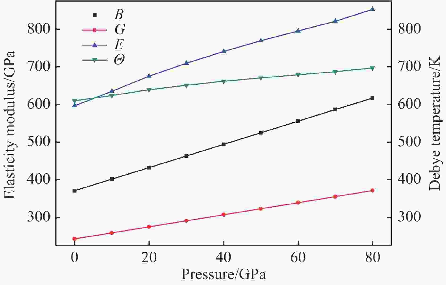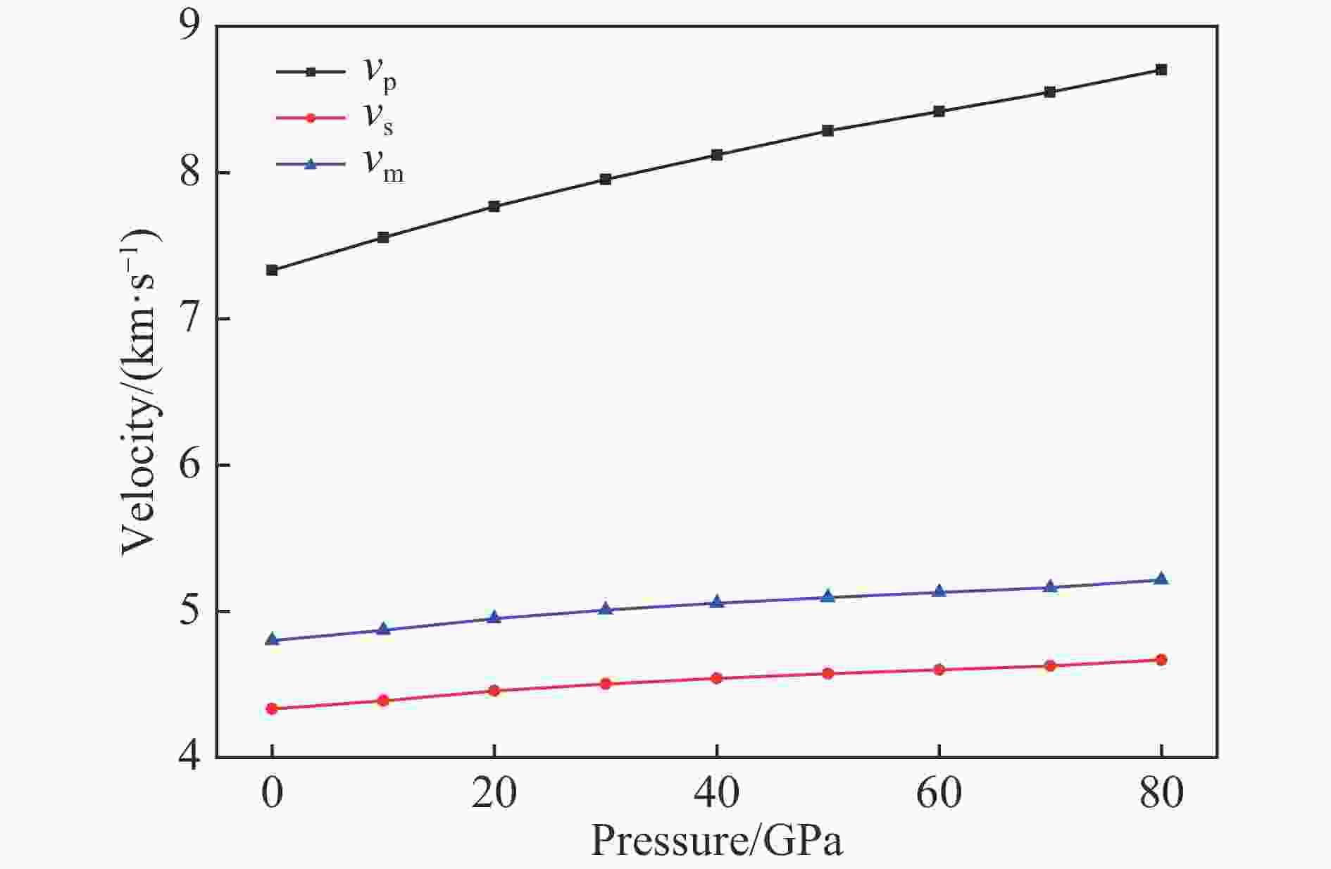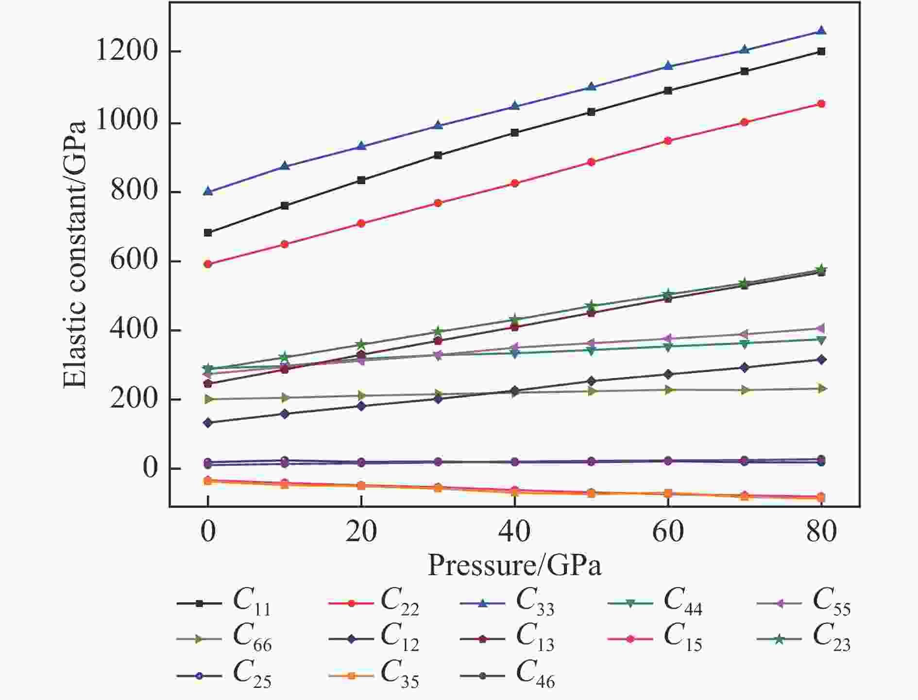 ${\;\beta}$ , equilibrium volume V0, bulk modulus B0, and its pressure derivation${B_0'}$ at p=0 GPa and T=0 K, together with other theoretical results [13, 27]Method a/nm b/nm c/nm $\beta$/(°) V0/nm3 B0/GPa B0′/GPa This work 0.682 0.282 0.939 142.38 0.027 59 361 4.78 Ref. [13] 0.682 0.284 0.936 142.30 0.027 60 Ref. [27] 0.683 0.284 0.939 0.027 77 表 2 在p=0 GPa和T=0 K下的体模量B、剪切模量G、杨氏模量E、泊松比