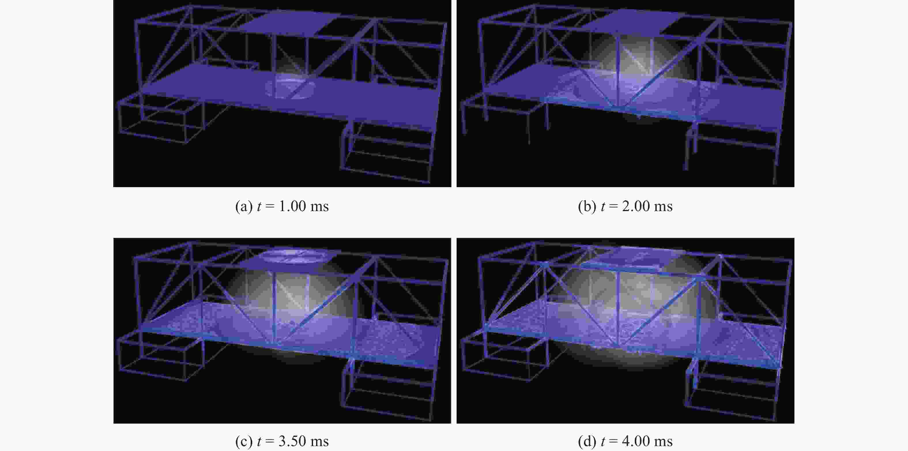 • 摘要: 桥梁作为交通枢纽中的重要关卡,受到强冲击载荷作用后的毁伤效果一直是国内外关注的热点问题。炸药爆炸是对其进行毁伤的最为有效的手段之一,研究爆炸冲击波在桥梁结构中的传播规律对桥梁结构抗爆设计和爆炸事故救援具有至关重要的作用。为此,搭建了桥梁的局部结构并进行爆炸毁伤实验,为数值模拟研究提供数据参考。采用自主开发的三维爆炸与冲击问题仿真软件EXPLOSION-3D对仿桥梁结构的爆炸冲击波传播问题进行了数值模拟研究。将数值模拟结果与实验结果进行对比,验证了数值算法的有效性;进一步通过对比不同位置处的压力时程曲线来分析爆炸冲击波在仿桥梁结构中的传播规律,并分析了炸药在不同位置处爆炸和不同当量炸药爆炸对桥梁结构毁伤的影响规律。基于数值仿真结果,得到了给定工况下炸药对仿桥梁结构内的人体和车辆的毁伤程度。最后,通过对比分析不同工况的数值模拟结果,从仿真的角度给出了安全预防建议。