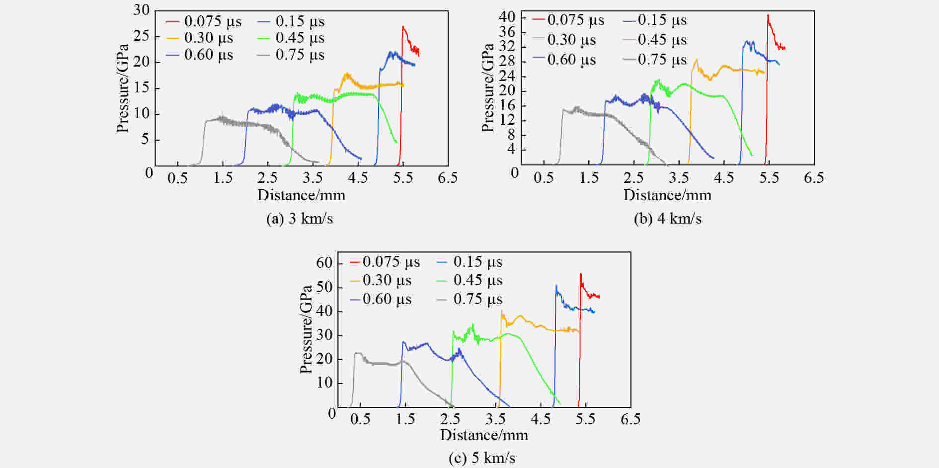 摘要: 选取合适的材料状态方程和强度模型,通过数值模拟分析超高速撞击下弹丸材料的破碎行为。弹丸的破碎主要有两种:稀疏波引起的层裂和材料在高压作用下的碎裂。由于层裂影响和高压影响下弹丸的破碎方式不同,导致两种情况下材料产生的碎片形状和大小不同。分析球形弹丸在撞击靶板过程中压力脉冲的传播及衰减形式发现:在弹丸和靶板尺寸相同的情况下,弹丸中压力脉冲的脉宽基本保持不变,而峰值压力随着撞击速度的增加而增加;在撞击速度相同的情况下,弹丸中压力脉冲的峰值压力基本不变,而压力脉冲的脉宽随着靶板厚度的增加而增加。弹丸中传播的压力脉冲与后期弹丸背表面的层裂相关,其峰值及变化速率直接影响背表面层裂厚度,其脉宽直接影响背表面沿弹丸径向的层裂深度。得到层裂厚度以及层裂破碎方式的影响区域,对研究后期碎片云分布有重要参考价值。Abstract: The appropriate material state equations and strength models were chosen. Through the numerical simulation results, the fragmentation behavior of the projectile material is analyzed. The fragmentation of the projectile mainly consists of spallation caused by release waves and fragmentation of the material under high pressure. Due to the influence of the spallation and the fragmentation method of the projectile under the influence of high pressure, It also causes the shape and size of the fragments produced by the material in two cases. This paper analyzes the propagation and attenuation of pressure pulses in a projectile during the impact of a spherical projectile on a target plate. It was found that the pulse width of the pressure pulse in the projectile remained substantially unchanged when the size of the projectile and the target were the same, and the peak pressure increased as the impact velocity increased. At the same impact velocity, the peak pressure of the pressure pulse propagating in the projectile is substantially constant, and the pulse width of the pressure pulse increases as the thickness of the target increases. The pressure pulse propagated in the projectile is related to the spallation of the back surface of the projectile. The peak value and rate of change of the pressure pulse directly affect the thickness of the back surface layer. The width of the pressure pulse directly affects the depth of the lamination of the back surface along the radial direction of the projectile. The affected area of the fracture-cracking method and the thickness of the spar are obtained, which have important reference value for the distribution of fragments in the debris cloud in the later stage.