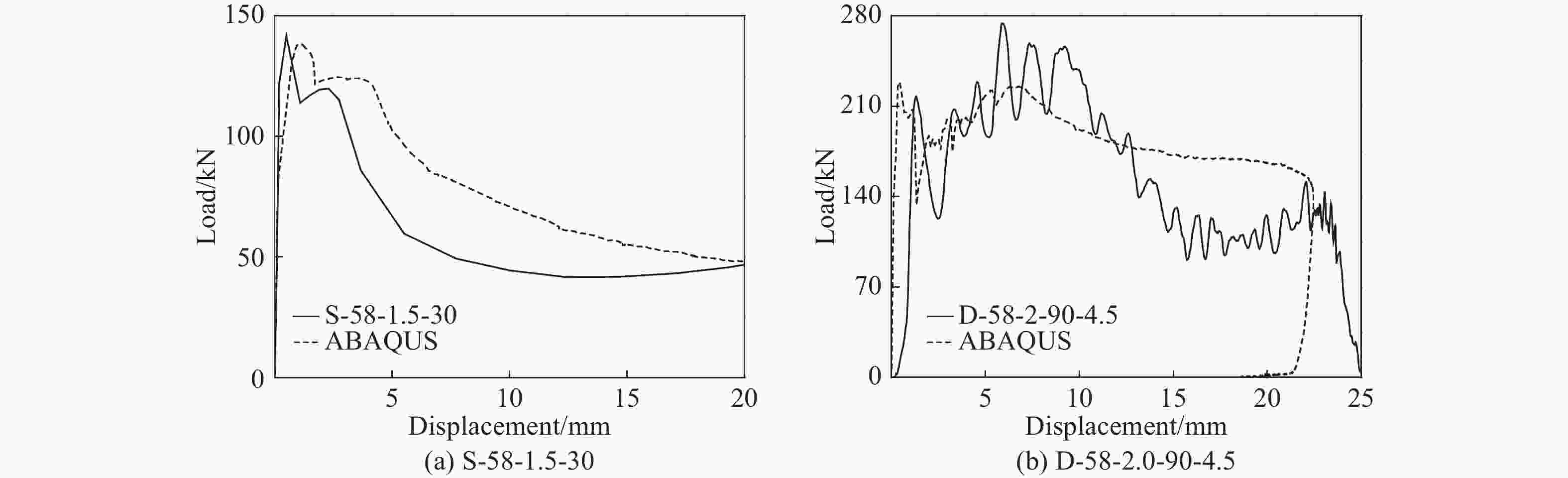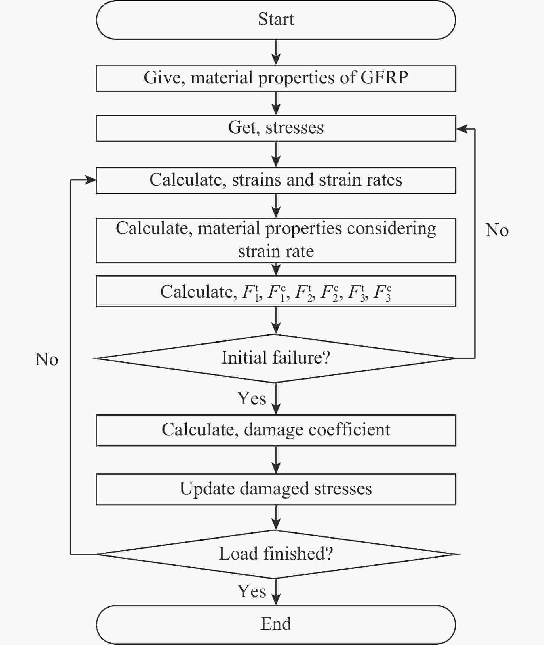 • 摘要: 讨论了玻璃纤维/环氧树脂复合材料(Glass Fiber Reinforced Plastic,GFRP)增强Q235圆钢管在低速冲击荷载作用下的应变率效应。通过轴压试验和轴向低速冲击试验获得了试件在准静态和低速冲击状态下的力学响应(轴向荷载及轴向位移),为后续仿真工作提供了依据。编写了可以考虑初始失效、损伤演化及应变率效应的GFRP材料子程序(VUMAT),并基于ABAQUS对构件的轴压及轴向冲击过程进行了仿真再现。通过仿真将不考虑应变率效应、只考虑钢管应变率效应、只考虑GFRP应变率效应、考虑钢管及GFRP应变率效应4种情况下的结果进行了对比分析。