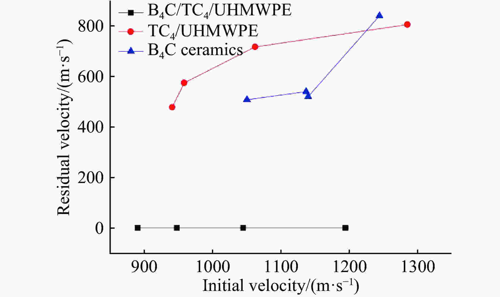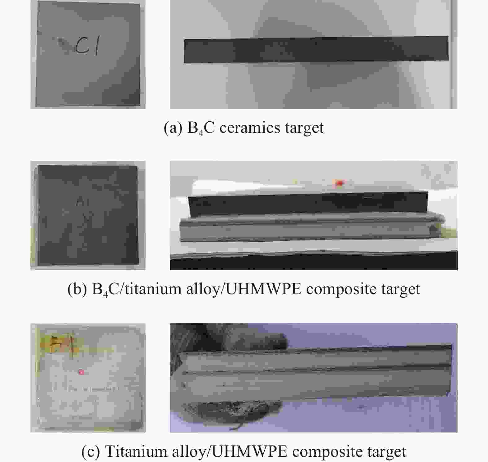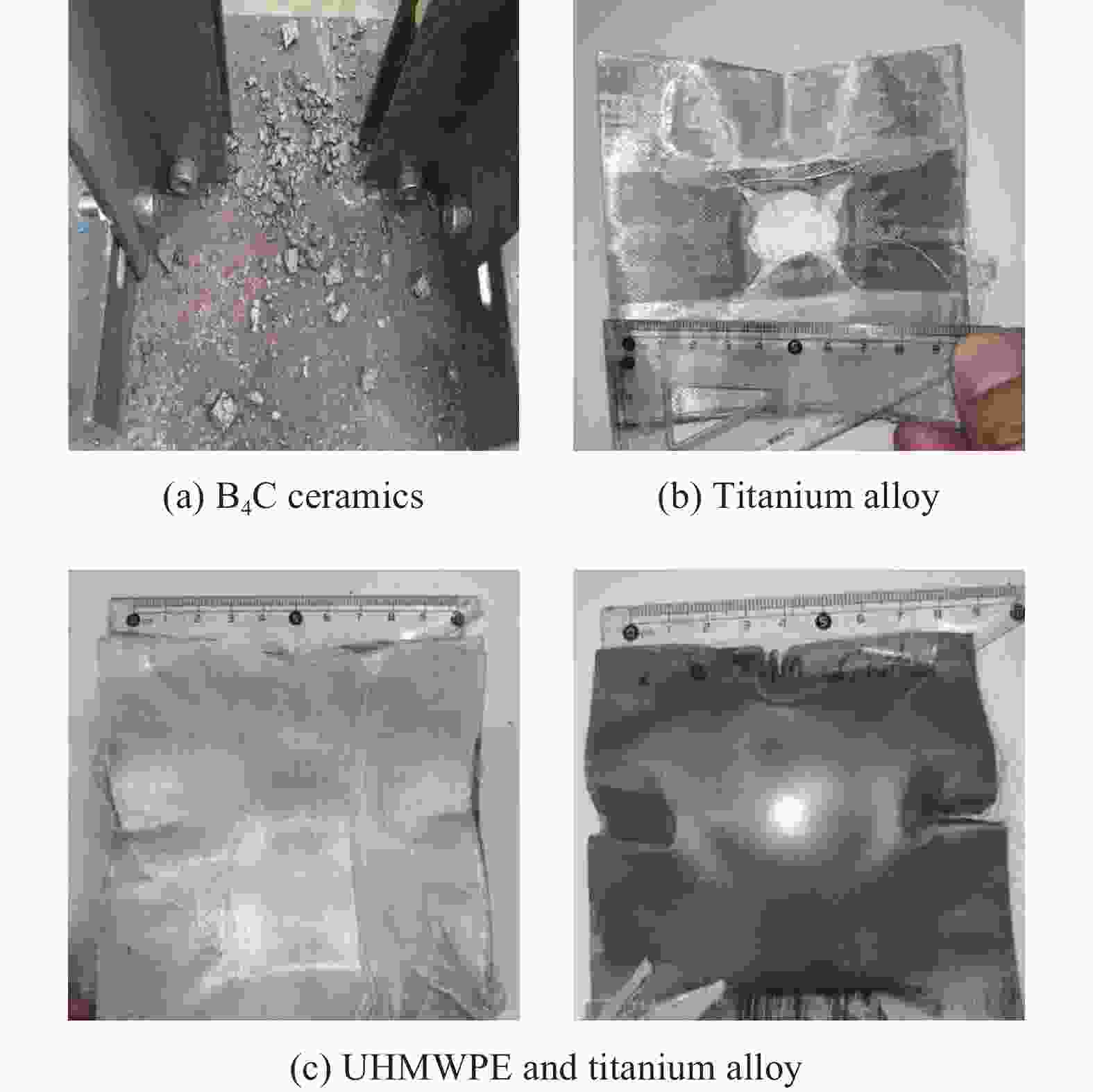 velocity/(m·s–1)Damage A1 B4C/TC4/UHMWPE/TC4 47.6 18.54 8.36 1194.2 Unpenetrated A2 B4C/TC4/UHMWPE/TC4 47.9 18.55 8.36 1044.5 Unpenetrated A3 B4C/TC4/UHMWPE/TC4 47.2 18.63 8.36 947.4 Unpenetrated A4 B4C/TC4/UHMWPE/TC4 47.6 18.82 8.36 890.0 Unpenetrated B1 TC4/UHMWPE 31.5 17.91 8.36 1284.8 805.3 Penetrated B2 TC4/UHMWPE 32.6 17.84 8.36 1061.8 716.7 Penetrated B3 TC4/UHMWPE 30.7 17.91 8.36 958.1 574.5 Penetrated B4 TC4/UHMWPE 32.7 17.85 8.36 940.5 478.3 Penetrated C1 B4C ceramics 32.0 10.06 8.36 1244.0 840.0 Penetrated C2 B4C ceramics 32.0 10.06 8.36 1136.6 520.2 Penetrated C3 B4C ceramics 32.0 10.05 8.36 1050.0 507.7 Penetrated C4 B4C ceramics 31.9 10.03 8.36 1139.6 570.0 Penetrated 表 3 靶板结构和实验结果(12.7 mm长杆弹)