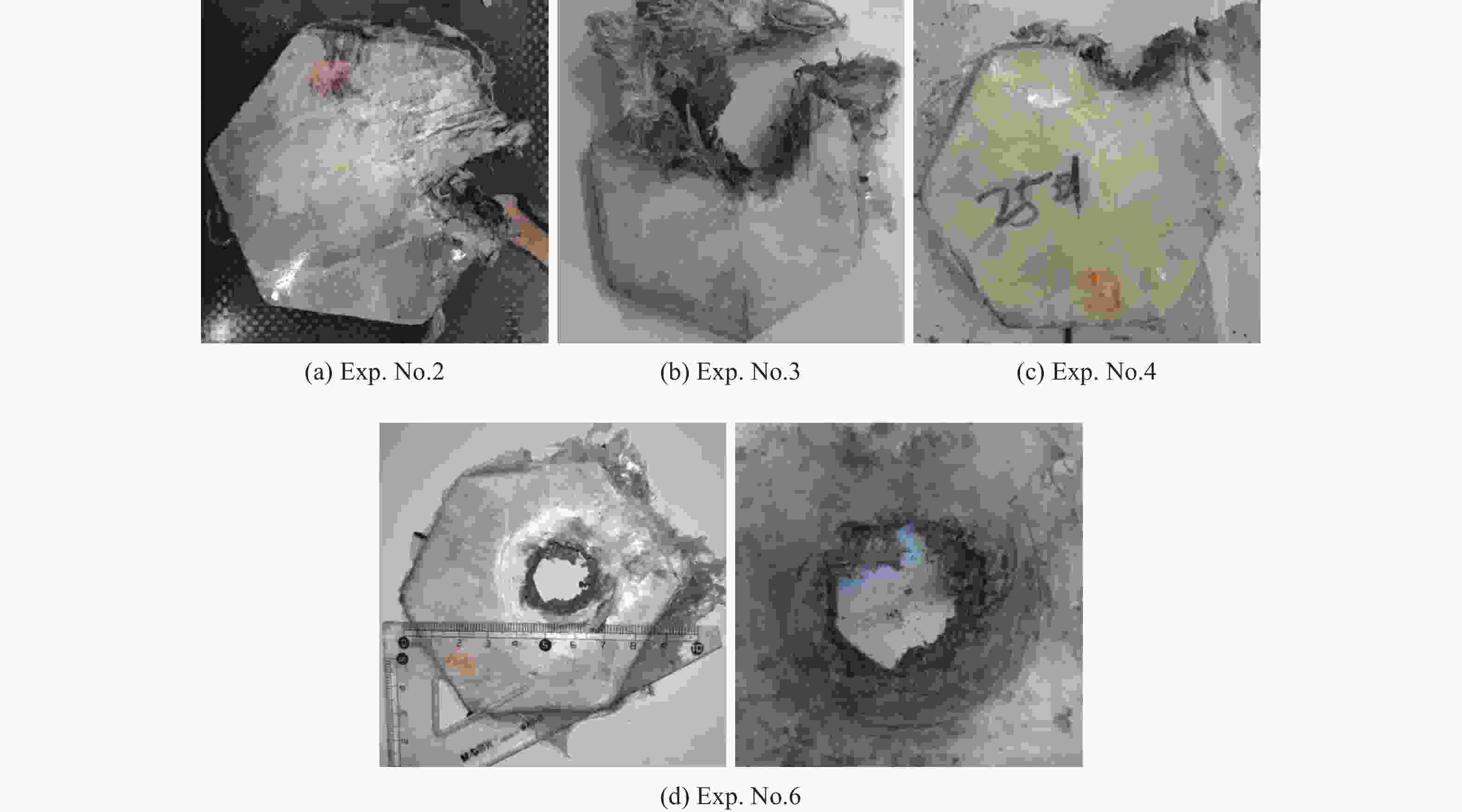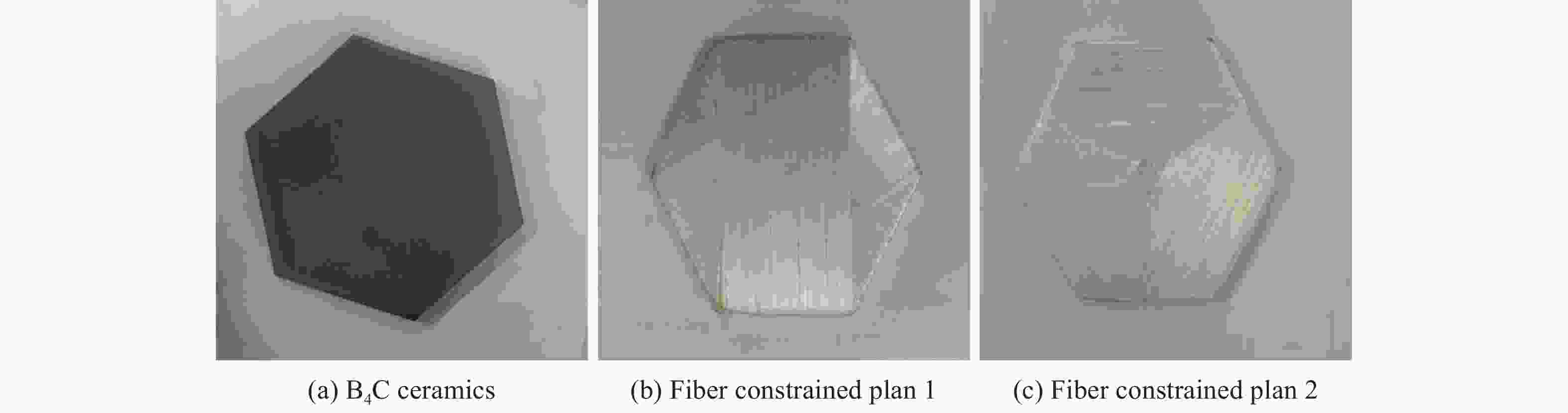 Target No. Target structure Projectile mass/g Projectile velocity/(m·s–1) Damage 1 B4C/20 mm aluminum plate 24.90 618.1 Unpenetrated 2 Fiber constrained plan 1/20 mm aluminum plate 24.85 643.5 Penetrated 3 Fiber constrained plan 2/20 mm aluminum plate 24.99 630.2 Penetrated 4 Fiber constrained plan 1/20 mm aluminum plate 24.96 658.2 Penetrated 5 B4C/20 mm steel place 24.97 641.4 Unpenetrated 6 Fiber constrained plan 1/20 mm steel place 24.96 622.8 Unpenetrated -