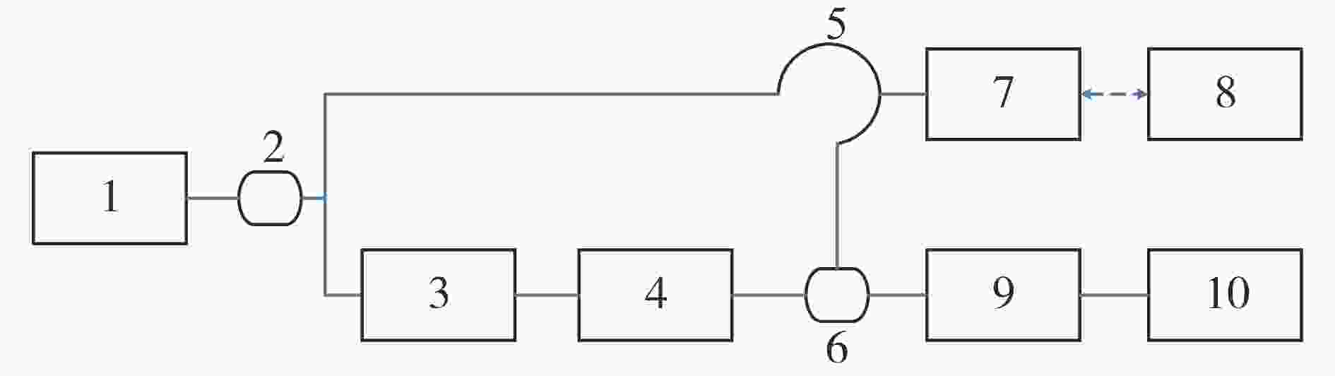 • 图  旁轴式外差结构PDV(1.激光器,2.分束器,3.移频器,4.衰减器,5.环形器,6.合束器,7.探头,8.被测物,9.探测器,10.示波器)
