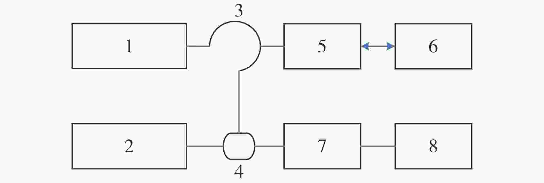 图  双光源模式PDV(1.信号激光器,2.参考激光器,3.环形器,4.合束器,5.探头,6.被测物,7.探测器,8.示波器)