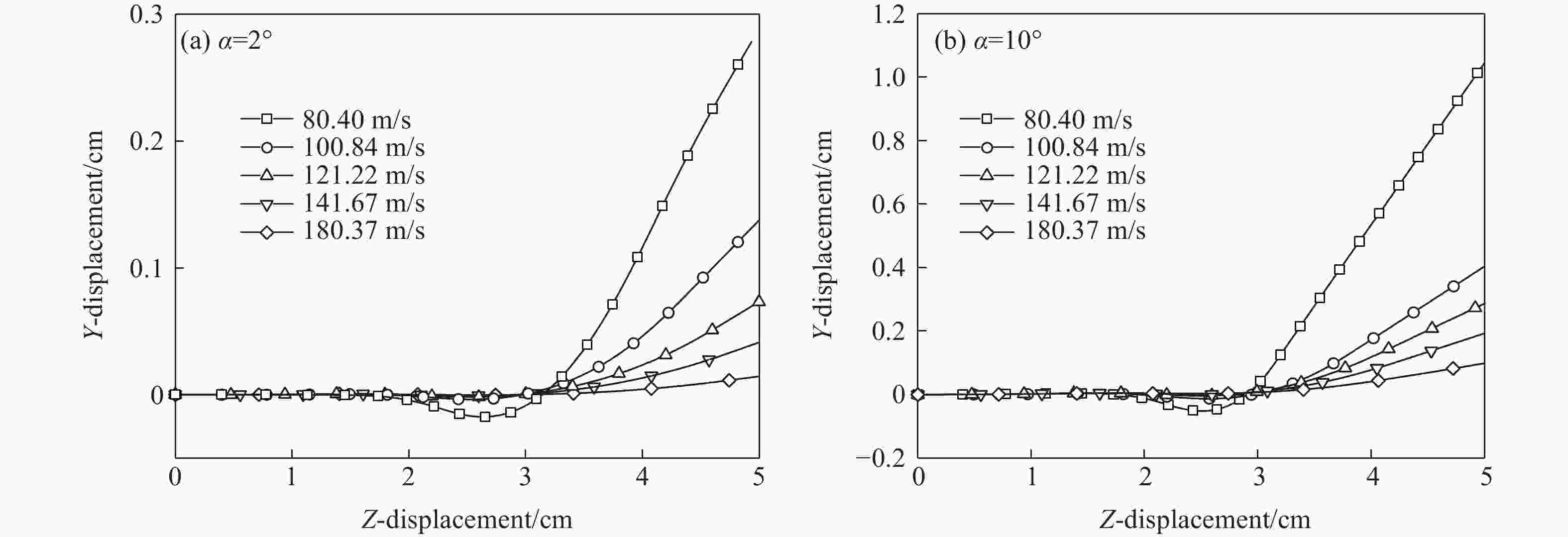 摘要: 为了研究攻角对锥头弹体贯穿薄钢靶破坏模式和弹体偏转的影响,利用ANSYS/LS-DYNA有限元软件建立了锥头弹体以2°~10°攻角贯穿薄钢靶的模型。先验证了模型及参数的可靠性,在此基础上进行了锥头弹体在不同攻角和初始速度条件下的贯穿数值模拟。结合靶板的破坏与弹体的偏转过程提出了一种四阶段分析模型,并系统地研究了攻角对弹道和弹体偏转角变化规律的影响。结果表明:攻角贯穿薄钢靶失效模式为非对称花瓣形破坏;攻角越大,初始速度越小(大于弹道极限速度),弹道偏转越明显;弹体偏转角变化规律与初始速度范围相关,当初始速度高于1.4倍弹道极限时,弹体偏转角呈现先增大后减小的变化趋势;弹体出靶时刻的角速度随攻角的增大而增大,随着初始速度的增加先反向增大后减小。Abstract: Numerical simulations are conducted for perforation of conical projectile impacting on thin steel target with various yaw angles to investigate the influence of yaw angle. The finite element models of conical projectile impacting on thin steel target with yaw angle varying from 2° to 10° are established with the non-linear finite element code ANSYS/LS-DYNA. After the reliability of numerical simulations is verified, numerical simulations of conical projectile impacting on thin steel target with different yaw angles and initial velocities are carried out. A four-step model to analyze the process of projectile’s deflection is addressed by comparing the process of target’s failure and projectile’s deflection. At last, we discuss the projectile’s trajectory angel deflection and angular velocity through the validated numerical analysis. The results show that the failure of asymmetric petalling occurs when a thin plate is impacted by conical-nosed projectile with yaw angle. With the increase of the yaw angle and the decrease of initial velocity, the deflection of the trajectory will be more obvious; the deflection change of projectile relates to the initial velocity; the deflection angle shows a trend of increasing first and subsequently decreasing when the initial impact velocity is relatively high (greater than about 1.4 times the ballistic limit). When the projectile moves out of target, the angular velocity rises with the increase of the yaw angle, but it increases reversely and then reduces with the increase of initial velocity.
