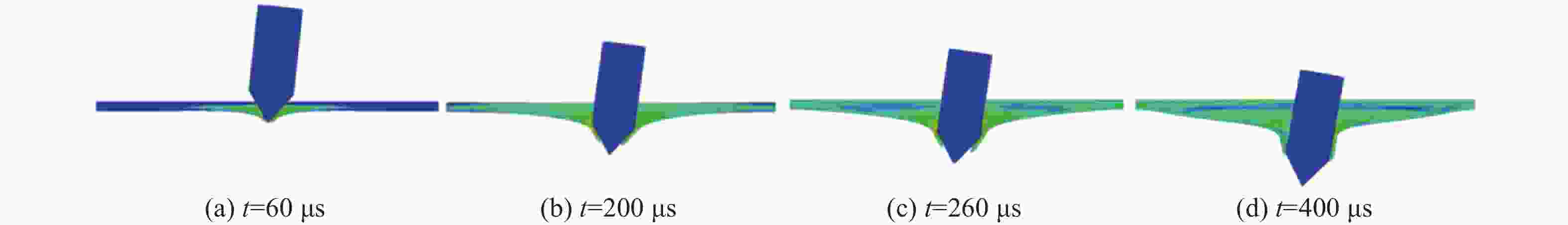 A/MPa B/MPa n c ${\dot \varepsilon _0}$/s–1 Tr/K Tmelt/K 154 464 0.37 0.02 0.0001 300 1600 m D1 D2 D3 D4 D5 $\chi $ 0.7 1.2 0 0 0 0 0.9 $\rho $/(g·cm–3) C0/(m·s–1) S1 ${\gamma _0}$ $a$ cp/(J·kg–1· K–1) 7.80 4578 1.33 1.67 0.47 470 表 2 弹体正撞击靶板的初始与剩余速度