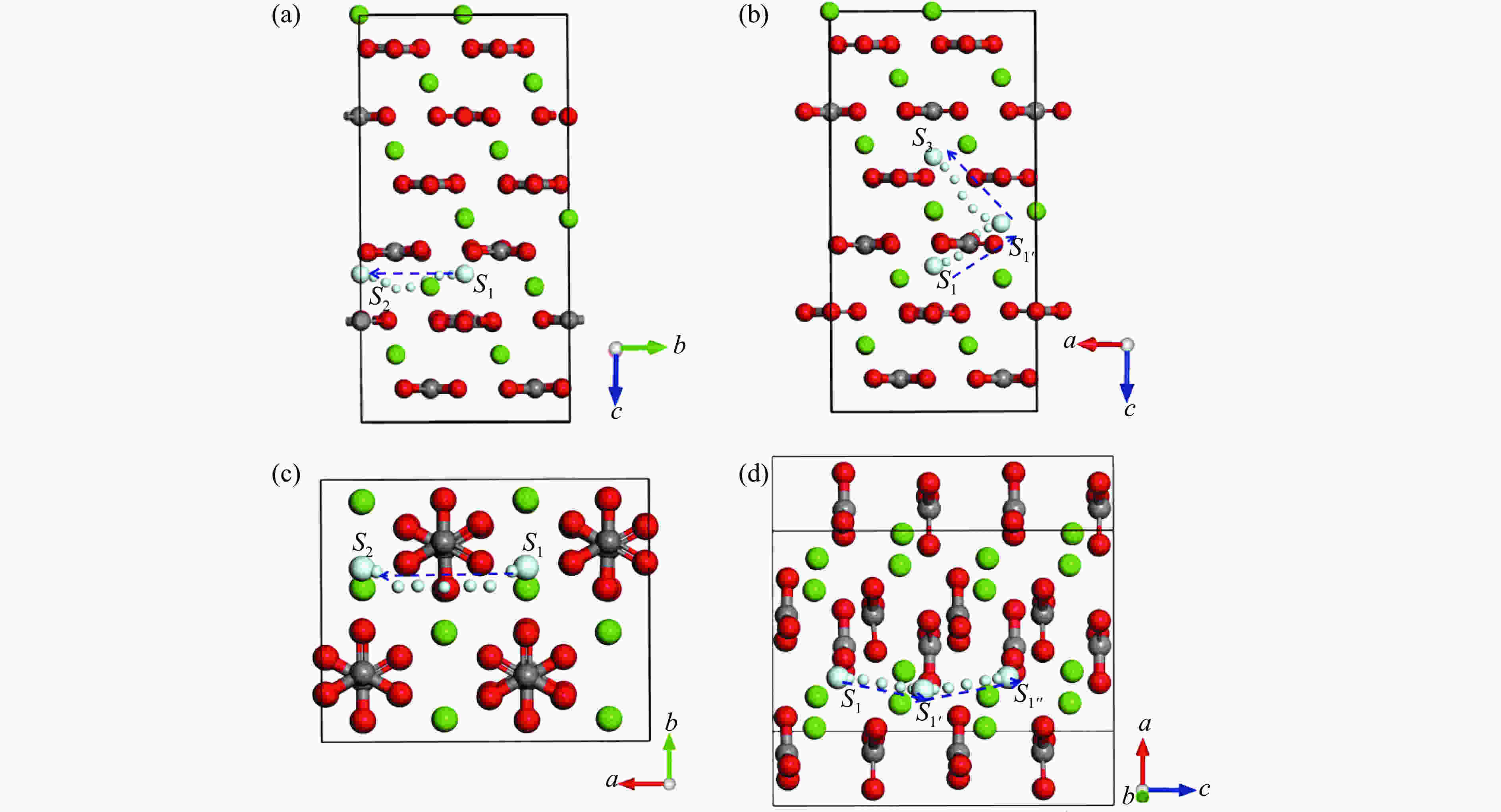 Figure  2.  Diffusion pathways of helium atom in calcite along [010] (a) and [001] via the S1′ site and reaching the S3 site (b); in aragonite along [100] (c) and [001] via the S1′ site and reaching the S1″ site (d)
