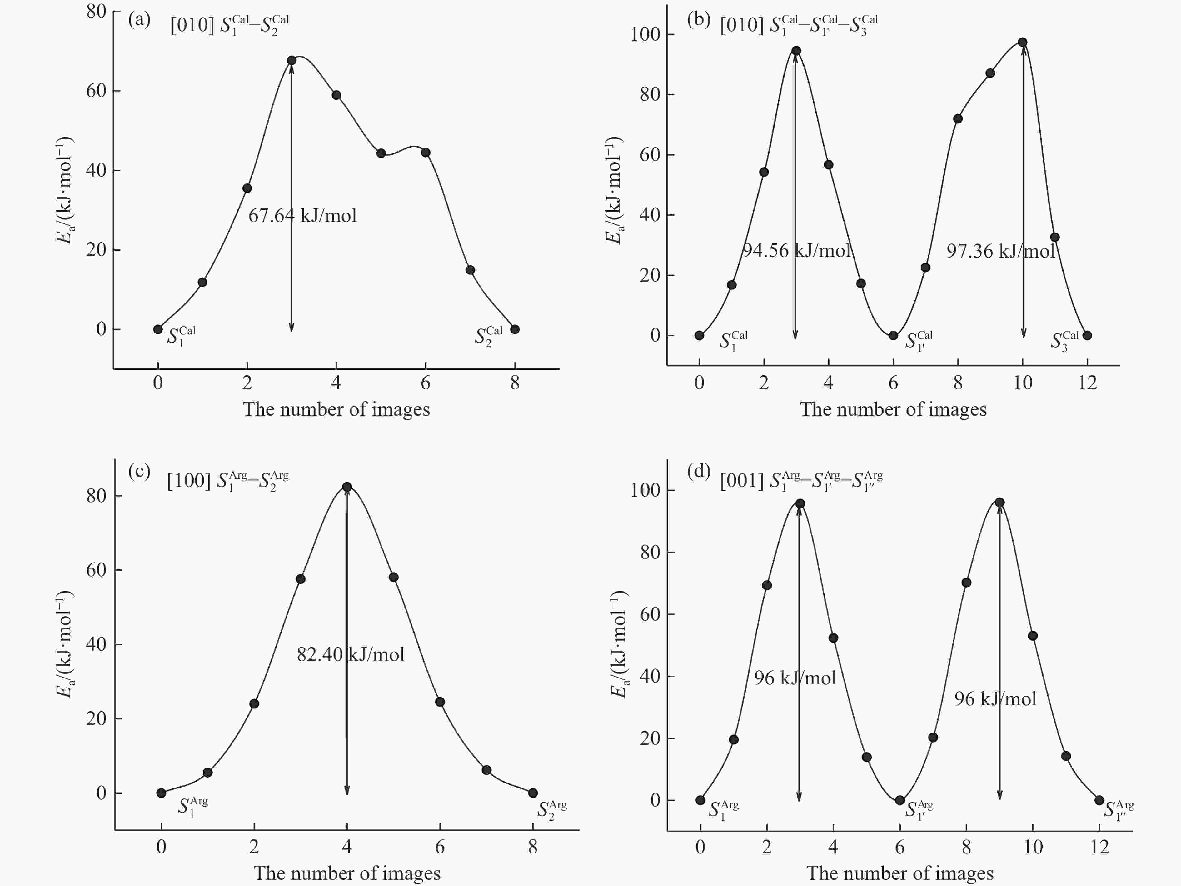Figure  3.  Energy barriers of different paths for helium diffusion in calcite: (a) ${S_1^{\rm Cal}- S_2^{\rm Cal}}$ path in the [010] direction, (b) ${S_1^{\rm Cal}- S_{1'}^{\rm Cal}-S_3^{\rm Cal}}$ path in the [001] direction; in aragonite: (c) ${S_1^{\rm Arg}- S_2^{\rm Arg}}$ path in the [100] direction, (d) ${S_1^{\rm Arg}- S_{1'}^{\rm Arg}-S_{1''}^{\rm Arg}}$ path in the [001] direction