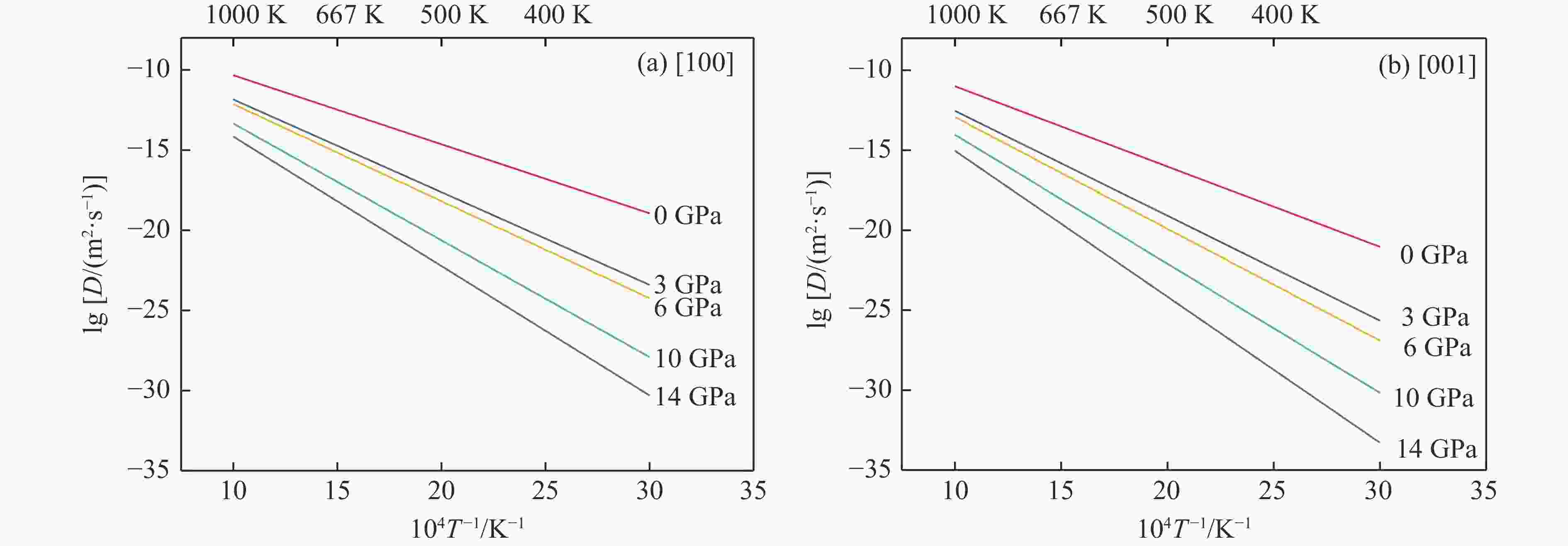 Figure  5.  Effect of pressure on helium diffusion in aragonite up to 14 GPa in the [100] (a) and [001] (b) directions (The diffusion coefficients obviously decrease with pressure increasing in both directions.)