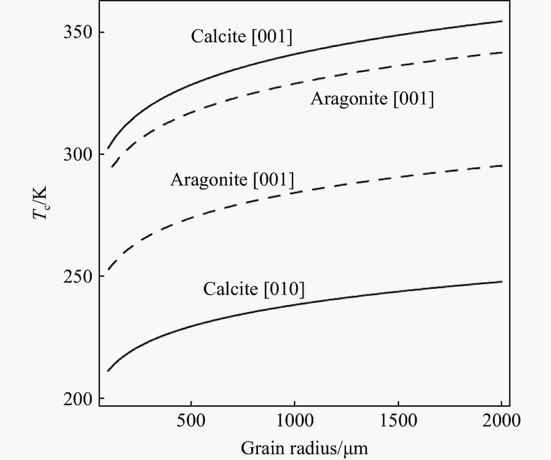 Figure  6.  Calculated closure temperature (Tc) as a function of grain radius (a) along different directions in calcite and aragonite (Closure temperature are plotted for assuming spherical geometry (A=55) of the crystals. Helium in each carbonate composition using Dodson’s (1973) equation and a cooling rate of 10 ℃/Ma.)