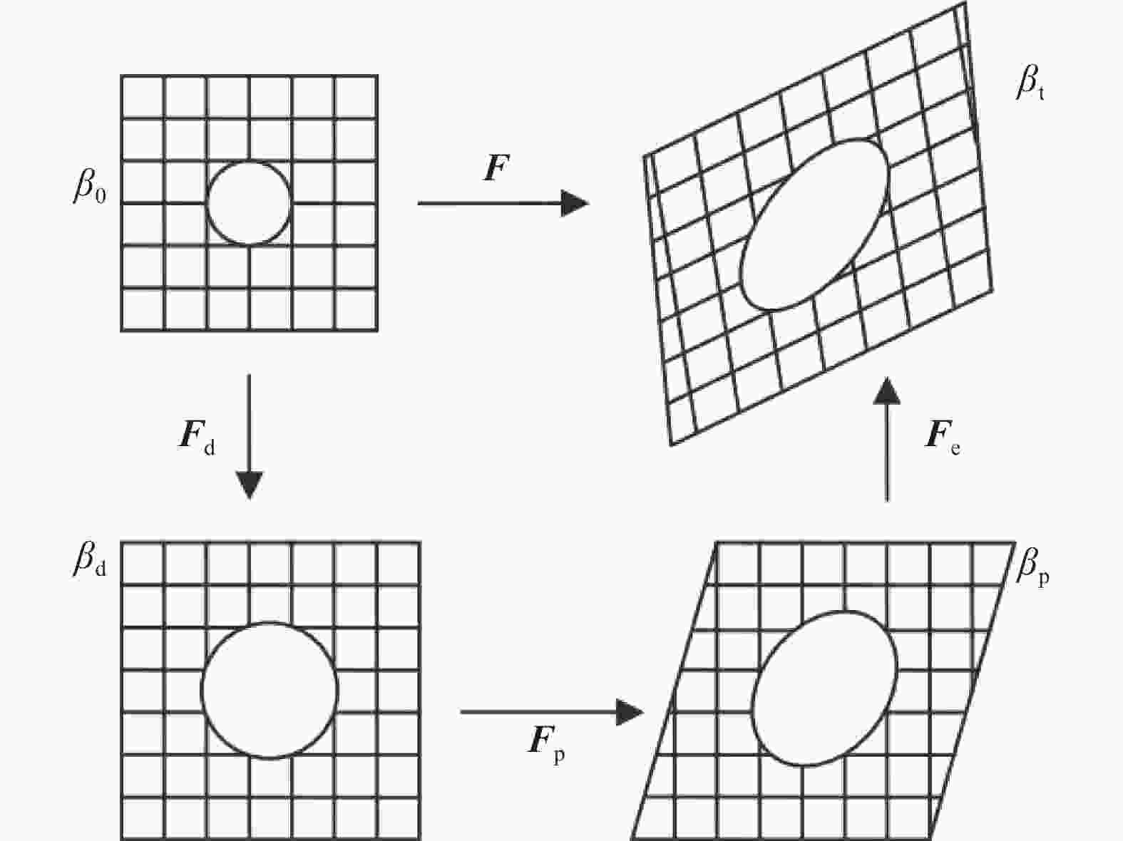 ${{F}} = {{{F}}_{\rm{e}}}{{{F}}_{\rm{p}}}{{{F}}_{\rm{d}}}$ ,包含可逆弹性部分${{{F}}_{\rm{e}}}$ 、不可逆偏量部分${{{F}}_{\rm{p}}}$ 以及不可逆体变部分${{{F}}_{\rm{d}}}$ [91]Figure 1. Schematic of a multiplicative decomposition of total macroscopic deformation gradient tensor