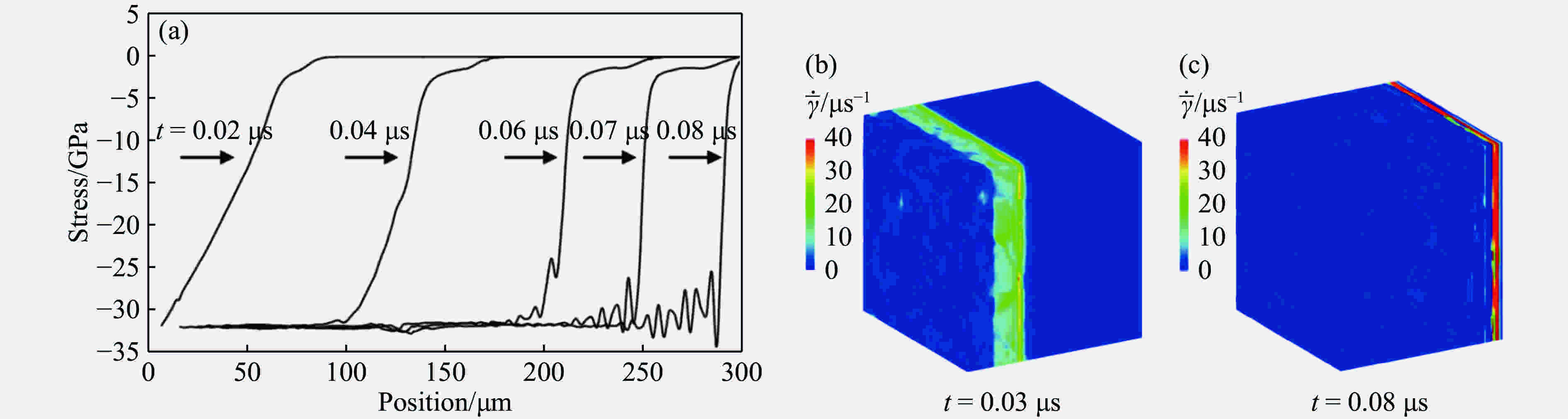 $ \alpha $ -RDX single crystal loaded up to 1.25 GPa along the [111] crystallographic direction (Solid lines correspond to the experimental results [101] while dashed lines correspond to the model predictions [100].)图 5 利用Lagrangean框架建立的唯象CPFE模拟等径角板牙的高应变率变形:(a)几何构型,其中V为此区域外加的速度场;(b)变形率分布[102]