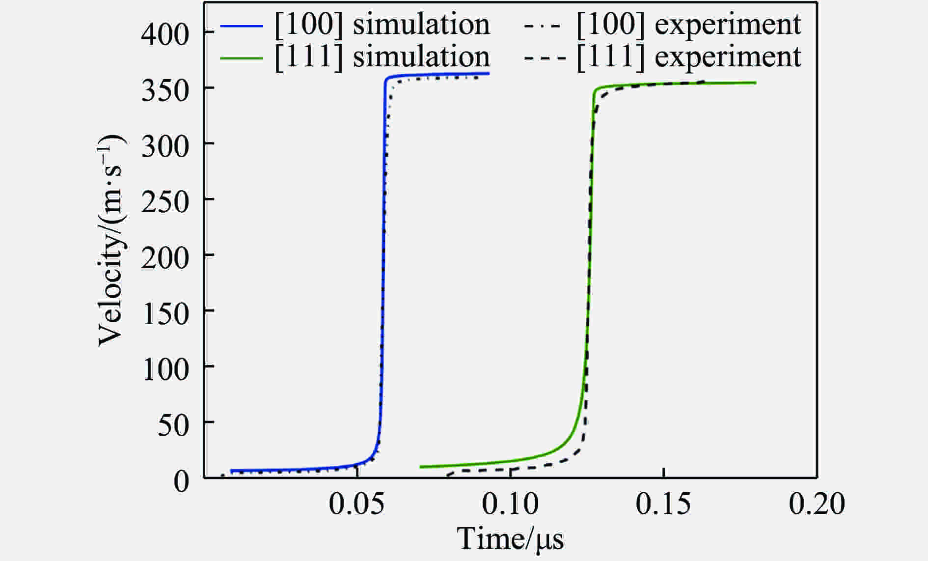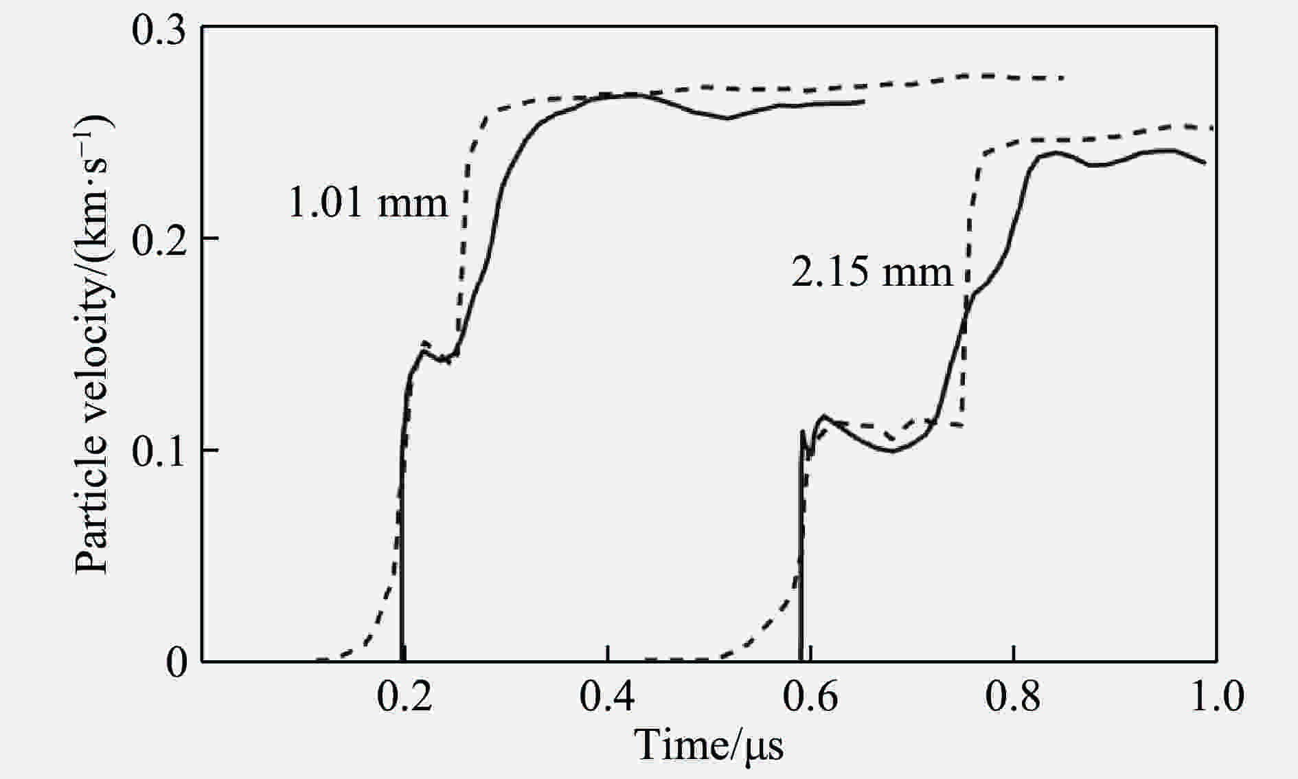 ${{F}}$ into elastic${{{F}}_{\rm{e}}}$ , irreversible deviatoric${{{F}}_{\rm{p}}}$ , and irreversible volumetric parts${{{F}}_{\rm{d}}}$ [91]图 4 RDX在[111]方向受到1.25 GPa加载时粒子速度剖面[100](实线是实验结果[101],虚线为模拟结果)