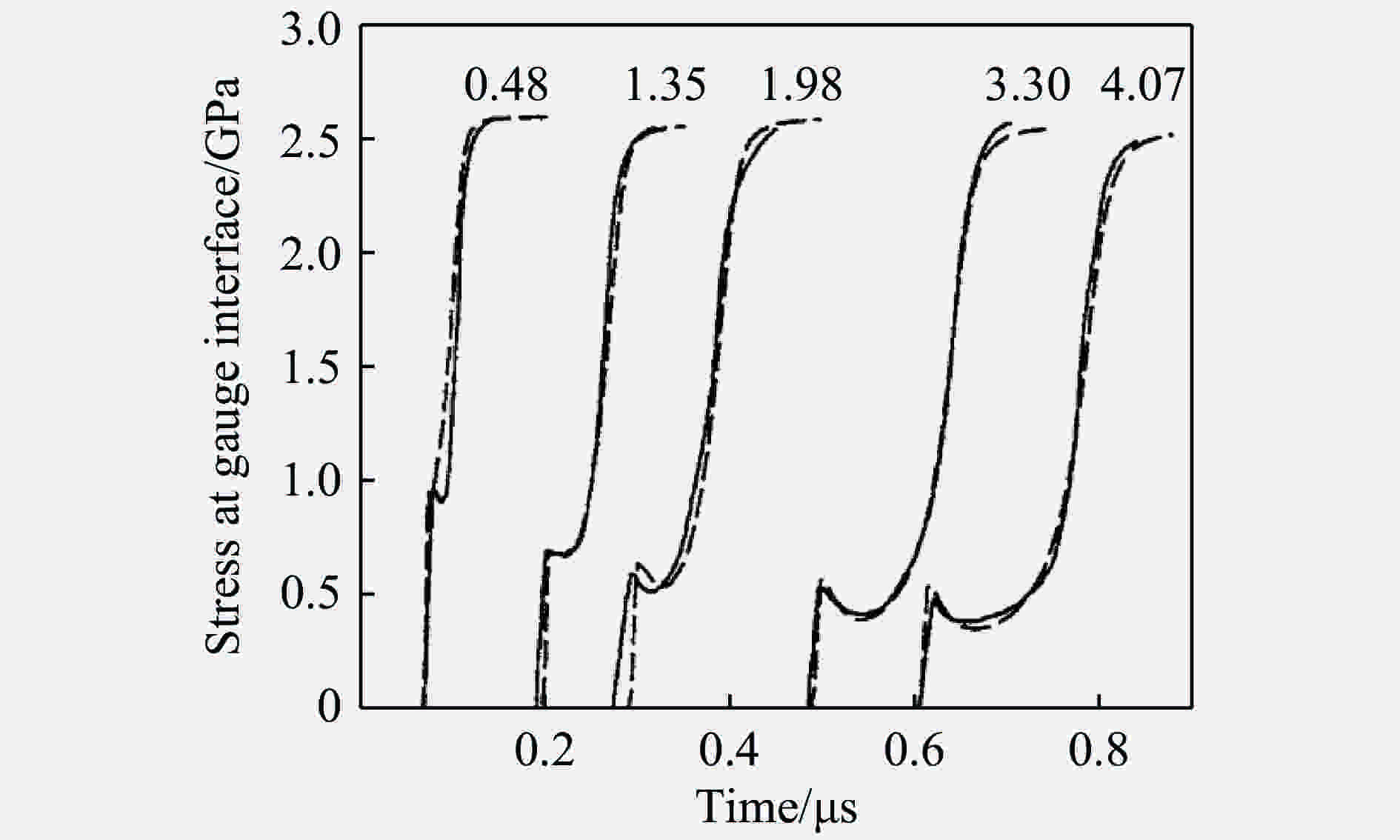 Figure 6. Measured and simulated longitudinal stress histories for LiF single crystals shocked along the [100] orientation by Winey-Gupta model [105] (The solid lines are the experimental data and the dashed lines are the simulations. The numbers above the curves indicate the sample thickness in mm. Time is relative to the moment of impact.)