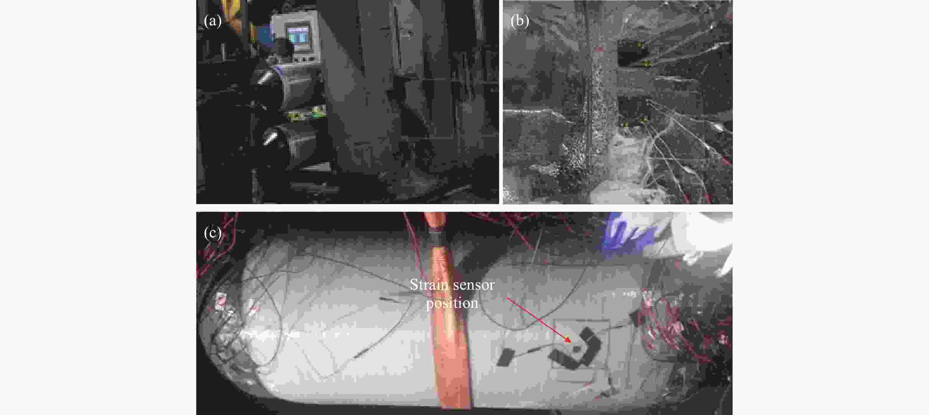 Figure 1. Preparation of the filament wound pressure vessel with the embedded strain gauges: (a) the fiber winding processing; (b) the strain gauges attached on the inner steel tank; (c) the pressure vessel with the embedded stain gauges
