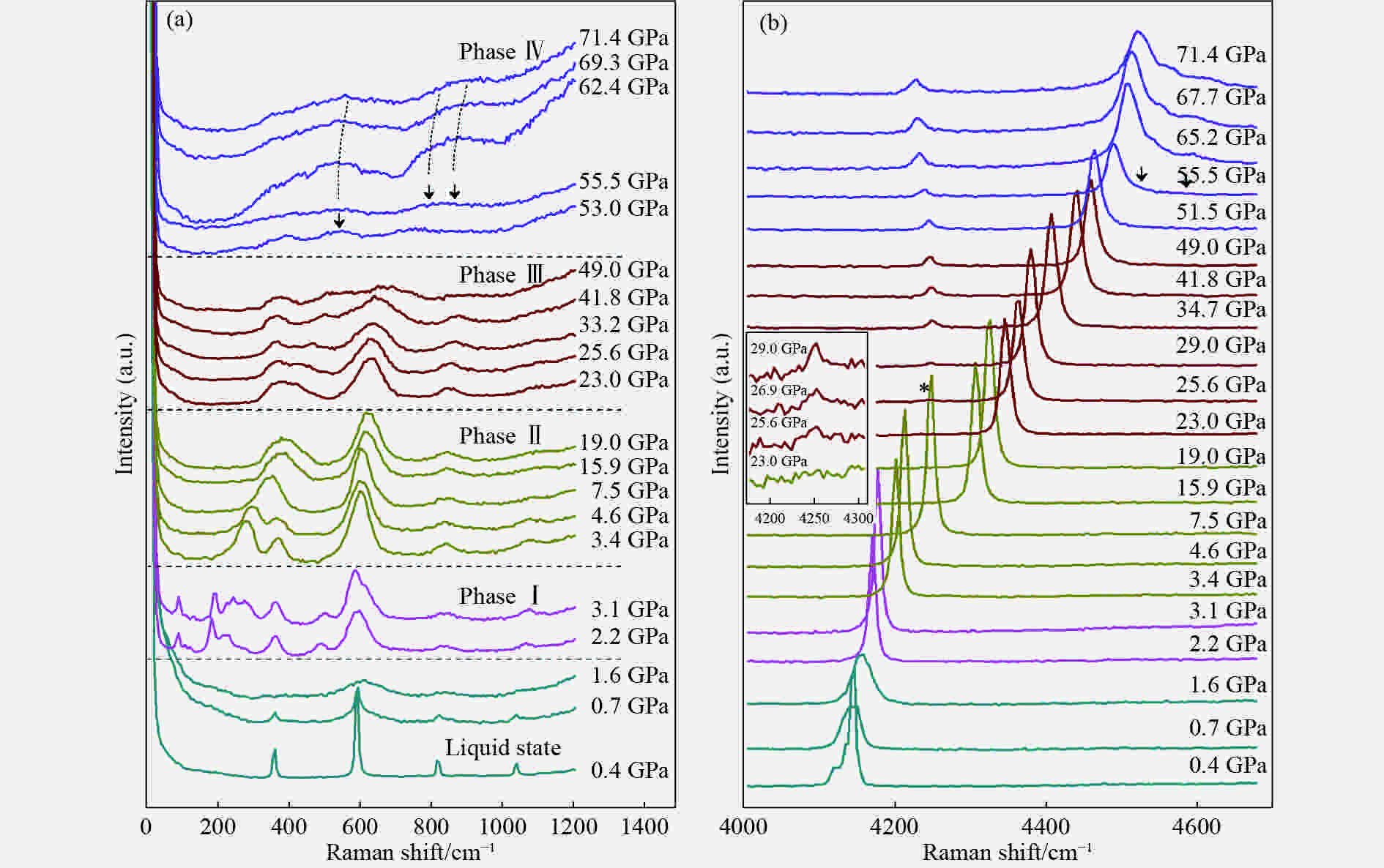 Figure 1. The evolution of Raman spectra of hydrogen hydrate with increasing pressure from 0.4 to 71.4 GPa. (a) The lattice peaks in the region of 0–1200 cm–1, where the spectra in each phase were marked by different colors and divided by dashed lines; the arrows marked three new broad peaks in high pressure phase IV; (b) The stretching peaks of H2 at various pressures, symbol * referred a new peak at 25.6 GPa in phase III, and the two shoulders at 55.5 GPa were marked by black arrow.
