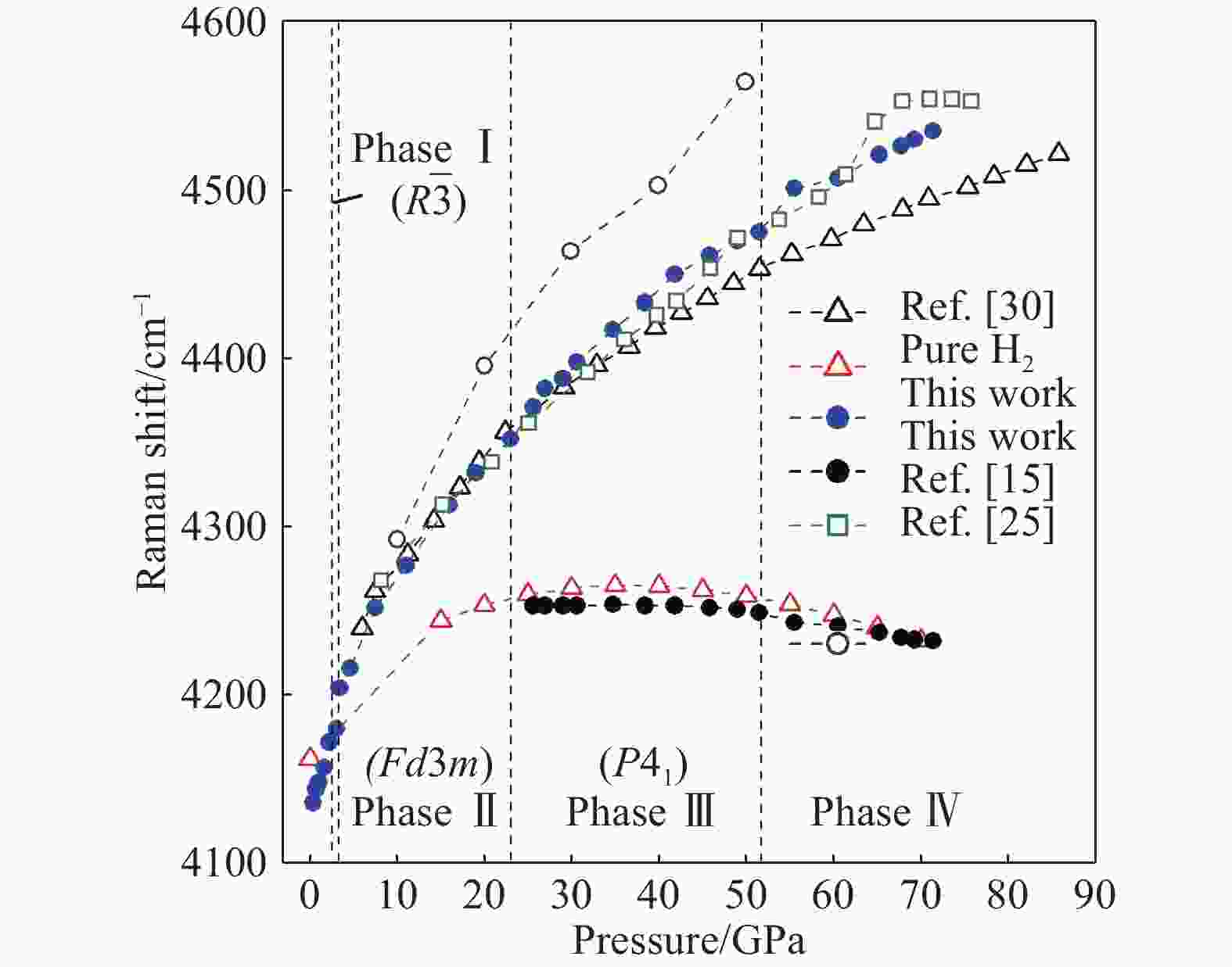 Figure 2. The frequency shifts of H-H stretching mode in hydrogen hydrate at various pressures in this work and referred researches. Symbols: the solid black and blue circles indicated frequency shifts collected in this work; the red triangle was frequency shift of pure H2 while the rest black triangle, green square and blue circle were hydrogen in hydrogen hydrate which were cited from previous experimental and theorical studies[15, 25, 30]. The pressure boundaries of each phase were marked by vertical dashed lines.