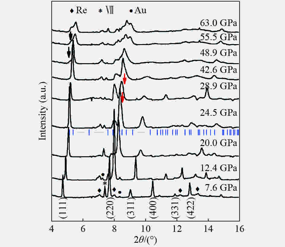 Figure 3. The synchrotron XRD measurement of hydrogen hydrate up to 63.0 GPa. The phase C2 was confirmed by characteristic diffraction lines (111), (220), (311), (400), (331) and (422) at 7.6 GPa. The splitting of line (220) was marked by red arrows at 24.5 GPa, while the splitting of line (111) at 48.9 GPa was marked by black arrows. A rough Pawley refinement of the theorical predicted P41 structure was performed with our experimental spectrum of 24.5 GPa, the short blue lines showed the calculated diffraction lines of refined structure with Materials Studio program.