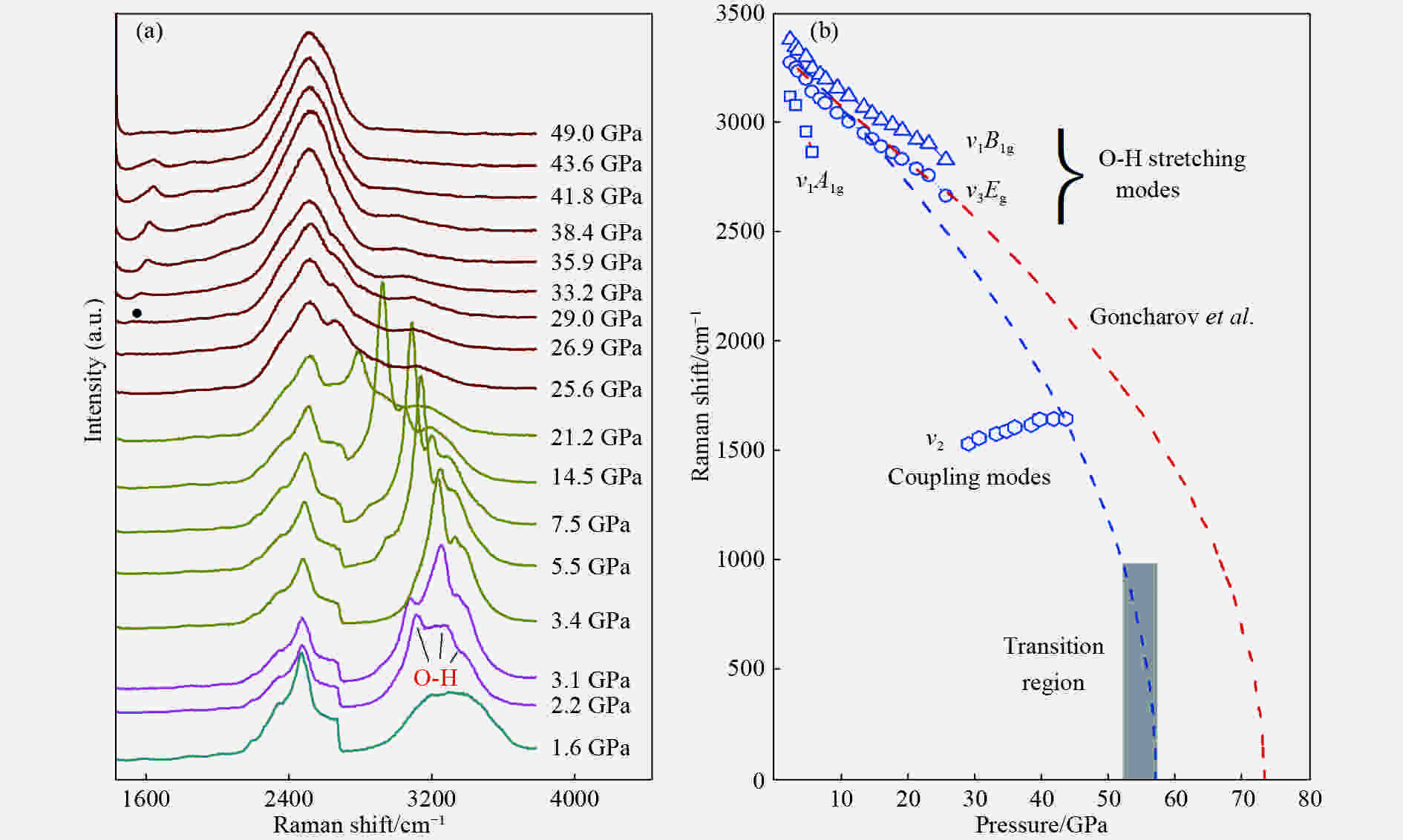 Figure 4. (a) The soften evolution of O-H stretching peaks with increasing pressure from 2.2 to 29.0 GPa; the intensity of deformational peak increased above 29.0 GPa owing to the Fermi resonance with the soften O-H stretching mode, which further shifted to low frequency region above 49.0 GPa. (b) The pressure dependence of the O-H stretching mode; the blue line guided the extrapolation of the soften O-H stretching mode, the red dashed line showed the O-H stretching mode in solid water for comparison[31].