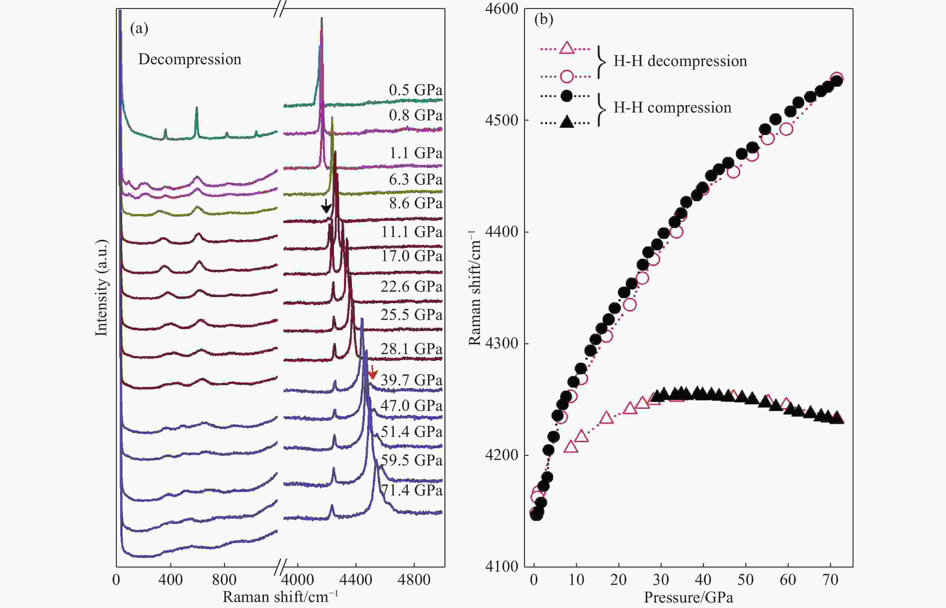 摘要: 氢水化合物作为潜在的环境友好型储氢含能材料引起了众多关注。结合金刚石对顶砧装置和原位拉曼光谱测量、同步辐射X射线衍射光谱测量两种表征手段,试图深入理解高压驱动下氢的特征行为,寻找可能的高压富氢相。结果显示,目前已知最高含氢比例1∶1的相C2在压力24.5 GPa时发生相变,更多的氢分子特征峰随相变出现。通过对理论预测结构的拟合,该相最终被确定为P41,氢水比例达到2∶1,且在卸压时能够稳定保存至8.6 GPa。考虑到冰中氢键对称化对压致相变和结构稳定性的重要作用,着重观测了氢键的行为,首次探测到水分子之间氢键对称化过程中完整的费米共振现象。通过对O-H对称伸缩振动模式软化行为的拟合,最终确定氢键对称化发生在55 GPa,同时拉曼光谱测量显示有更进一步相变伴随发生。氢水化合物中不同氢团簇对化学预压作用表现出截然不同的应激反应,这在此体系中也是首次被注意到,对含氢体系和纯氢中氢的金属化研究具有一定参考作用。Abstract: Hydrogen hydrate (H2-H2O) excited significant interest as an environmentally clean and efficient hydrogen storage material. Here we conducted a high-pressure experimental research on hydrogen hydrate combined with in-situ Raman spectroscopy and synchrotron X-ray diffraction measurements. Our results indicated that the cubic C2 phase with stoichiometry 1∶1 of H2 and H2O transformed to a new tetragonal phase C3 after packing more hydrogen molecules above 24.5 GPa. The structure of C3 was determined to be P41 with a 1∶2 ratio of H2O to H2, and could survive down to 8.6 GPa upon decompression. Two districted behaviors of guest hydrogen clusters were observed with increasing pressure. One showed blue-red frequency shift transition similarly as pure hydrogen, the other continuously blue-shifted to higher frequencies in the whole pressure range. Fermi resonance between the deformational mode and softened stretching mode was firstly detected, indicating that the hydrogen-bond was symmetrized at around 55 GPa. The complicated behaviors of hydrogen molecules and interactions with water molecules in hydrogen hydrate provided a different insight into the guest-host system under pressure.