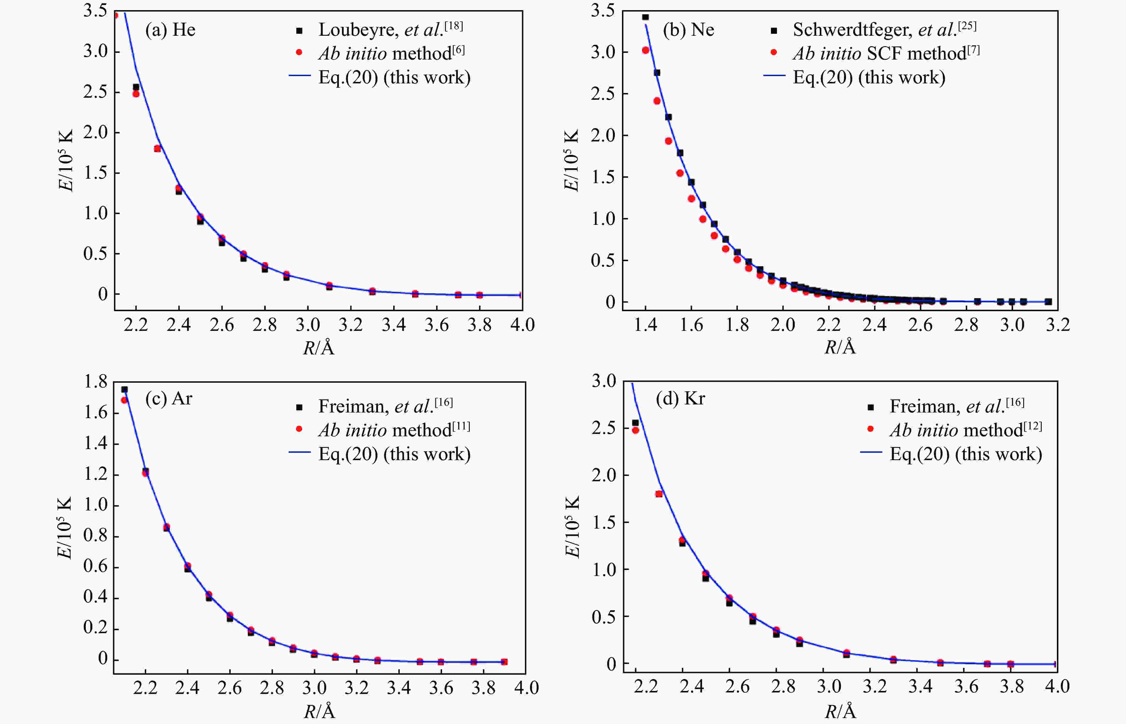 R/Å V/(cm3·mol–1) P/GPa Error/% Exp.[24] Ab initio[11] Eq.(10) 2.40 5.887 237.61 248.95 247.04 3.97 2.45 6.262 194.11 204.44 200.72 3.41 2.50 6.653 158.51 167.59 163.25 3.00 2.55 7.061 129.38 137.12 132.81 2.65 2.60 7.484 105.53 111.96 107.98 2.32 2.65 7.924 86.02 91.23 87.70 1.95 2.70 8.381 70.06 74.18 71.12 1.51 2.75 8.856 57.00 60.20 57.57 1.00 2.80 9.348 46.34 48.75 46.49 0.32 2.85 9.857 37.62 39.41 37.54 –0.21 2.90 10.385 30.51 31.80 30.31 –0.66 2.95 10.932 24.71 25.62 24.65 –0.24 3.00 11.497 19.99 20.60 19.79 –1.00 -