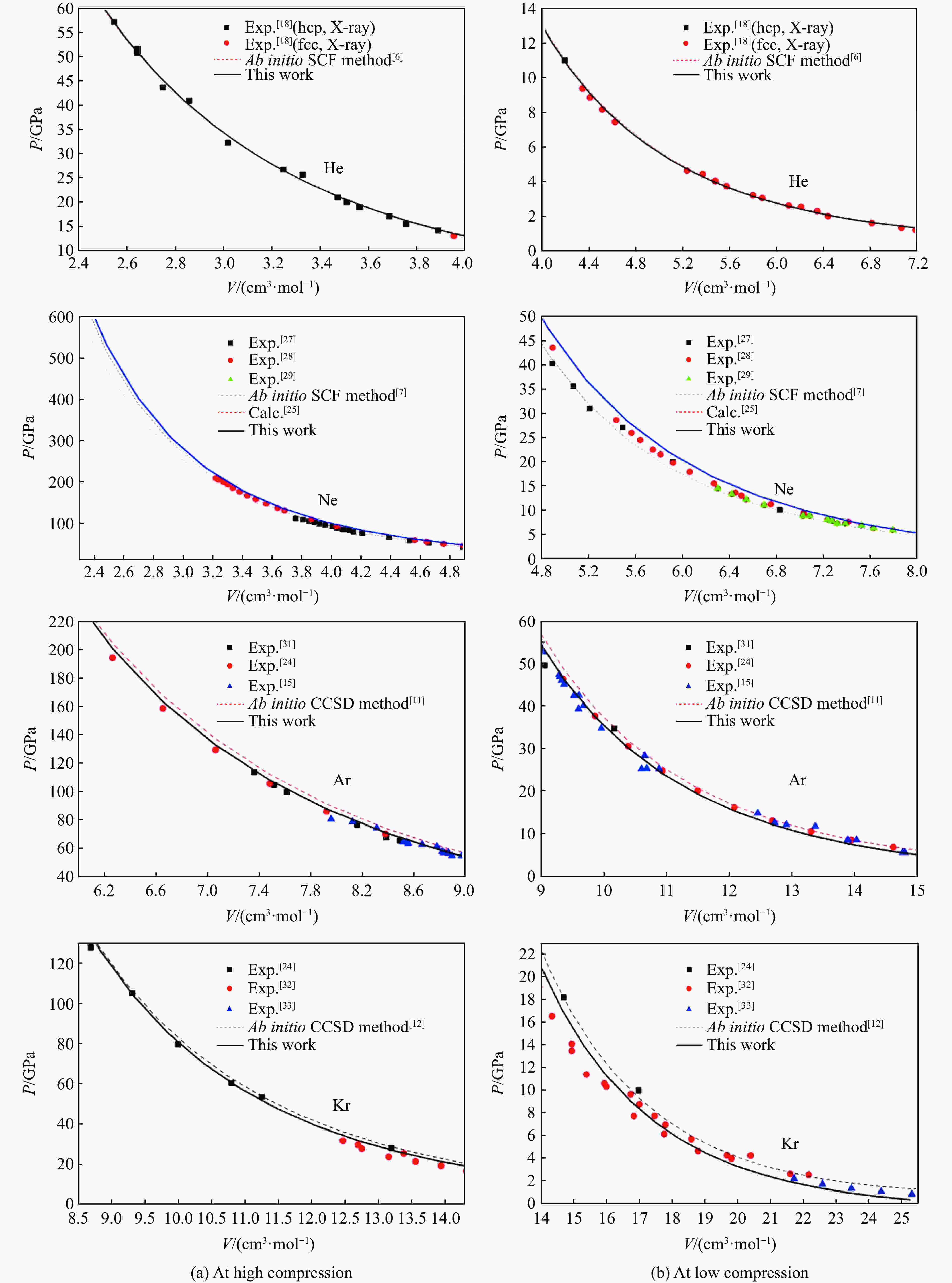 $\beta $ (其值为0.5),使得势函数的表达形式更加简单、准确。对比结果表明,结合能的新势函数能够准确地描述多体相互作用对结合能的贡献,且平均相对误差在5%以内。结合能的新势函数对压缩特性的影响在当前实验压强范围内(氦60 GPa、氖238 GPa、氩114 GPa、氪128 GPa)做出了令人满意的描述,且与实验值及理论计算结果基本完全吻合,平均相对误差在3%以内。最后,以固氩的压强数据为例,验证了势函数的准确性。该势函数不仅适用于更宽密度和更高压强范围,而且对所有惰性元素原子各种状态的结合能、高压压缩特性、定容比热容、熔化曲线和弹性模量的研究具有重要的指导意义。Abstract: Based on quantum theory and atomic cluster theory, using many-body expansion method and the ab initio method, a novel expression is presented for calculating the cohesive energy of rare-gas solids (RGS) (RGS=He, Ne, Ar, Kr) and studying the cohesive energy contribution to the highly compressed characteristics for RGS. In this expression, we introduce a new coefficient$\beta $ =0.5, which makes the expression of potential function simple and accurate. Compared with previous results, it is necessary to obtain a new cohesive energy expression that can describe accurately the many-body interaction contribution to cohesive energy, and the mean relative errors are within 5%. The expression can also be applied to calculate the compressibility of solid helium, neon, argon and krypton in the present experimental pressure range (He 60 GPa, Ne 238 GPa, Ar 114 GPa, Kr 128 GPa), and the numerical results are consistent with the recent experiment results and ab initio calculation results with the mean relative errors of no more than 5%. Finally, an application in solid argon verifies the accuracy of the potential expression. The expression not only can be applicable in a wider density and pressure range, but also all rare gas systems. In addition, it has important guiding significance for studying the high-pressure compression, specific heat, melting curve and elastic modulus of rare-gas solids. -