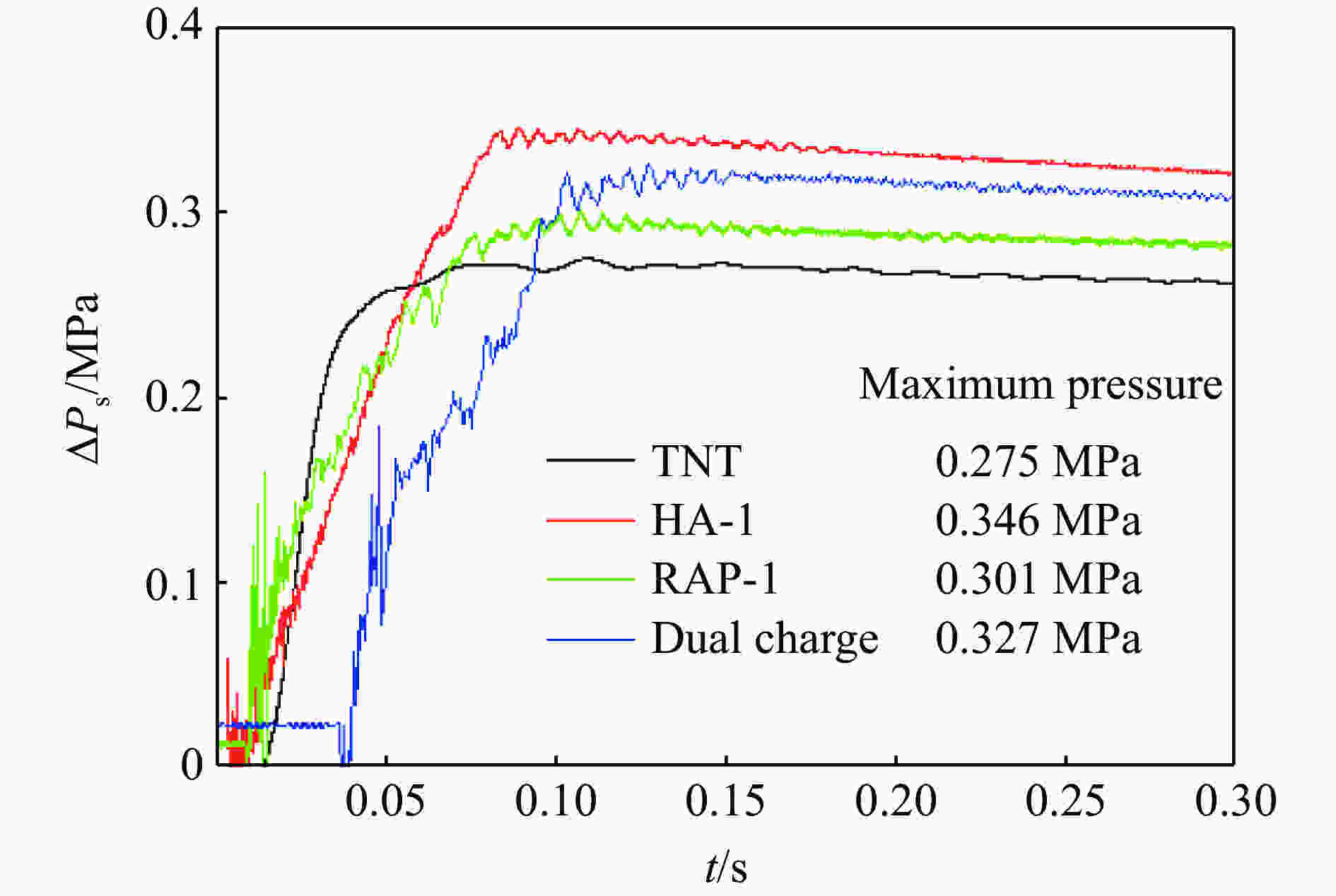 Explosive ${\Delta P/{\rm{MPa}}}$ Specific impulse/(Pa·s) TNT 8.29 893 HA-1 12.75 1170 RAP-1 6.37 658 Dual charge 7.89 1110 -