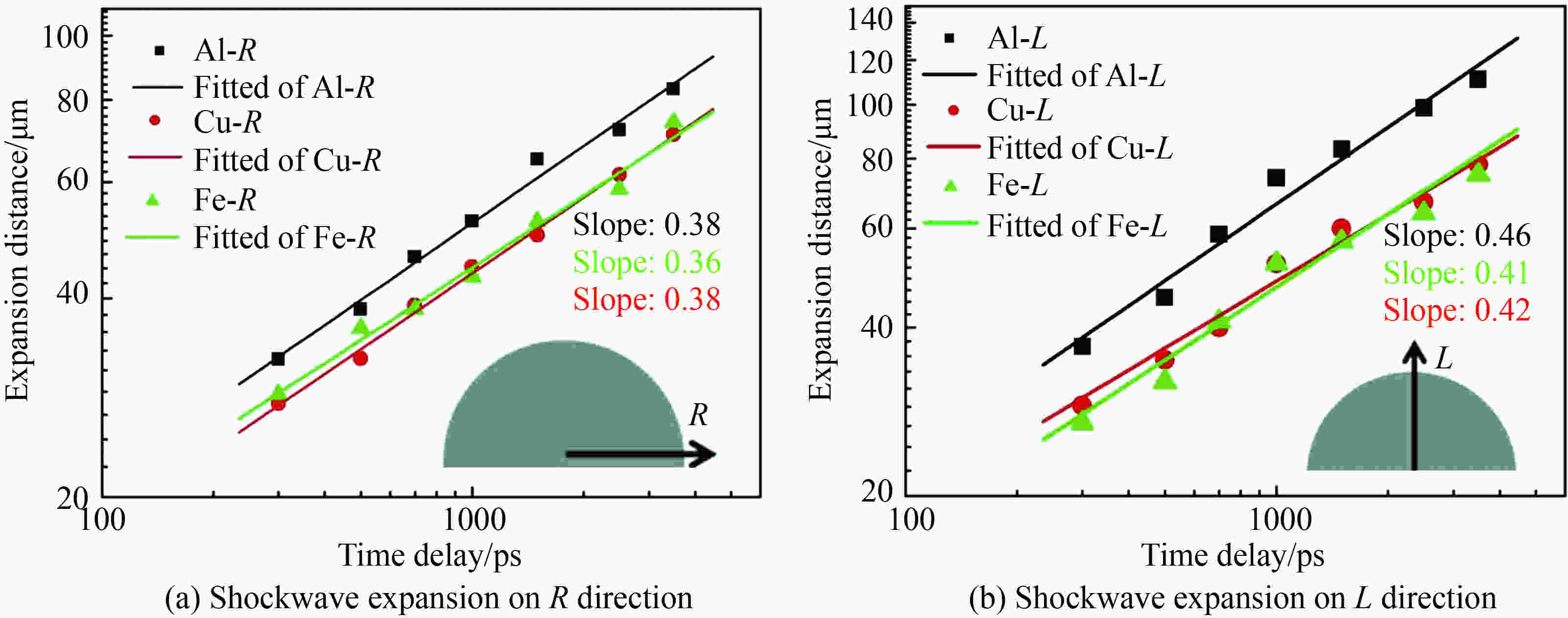 图  飞秒激光烧蚀Al、Cu和Fe金属表面冲击波膨胀动力学分析