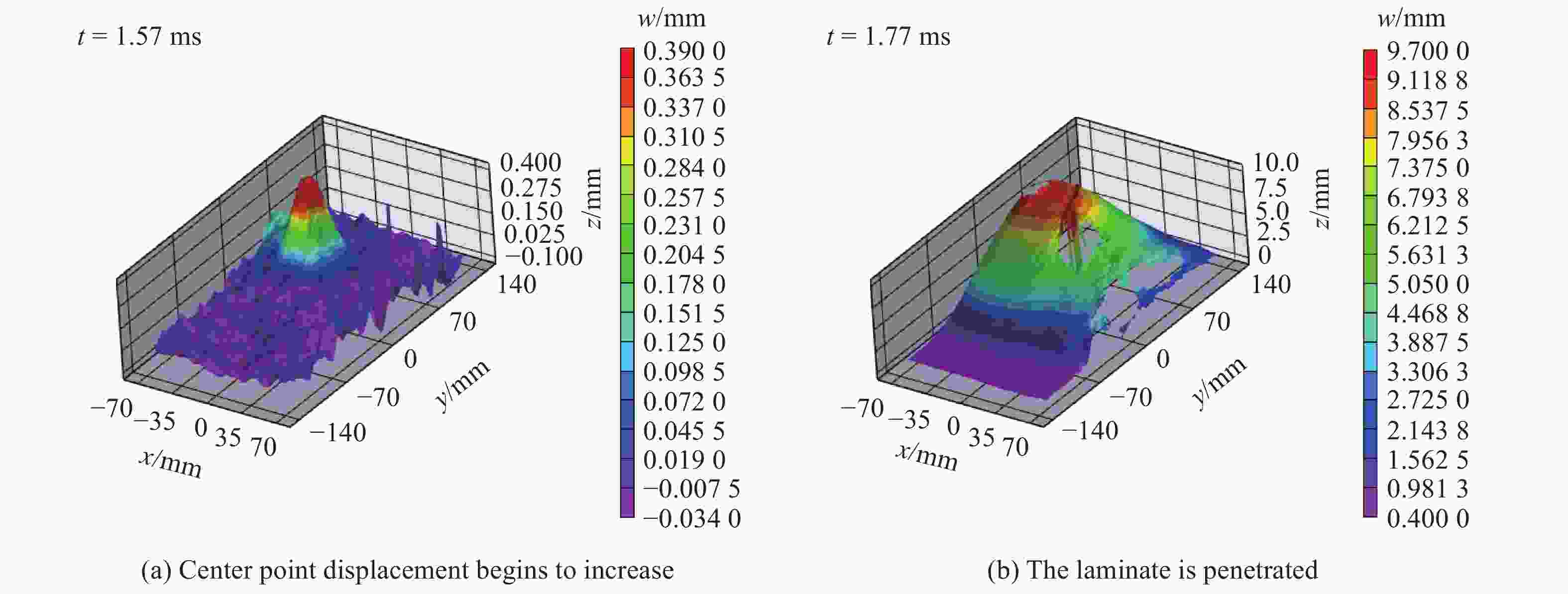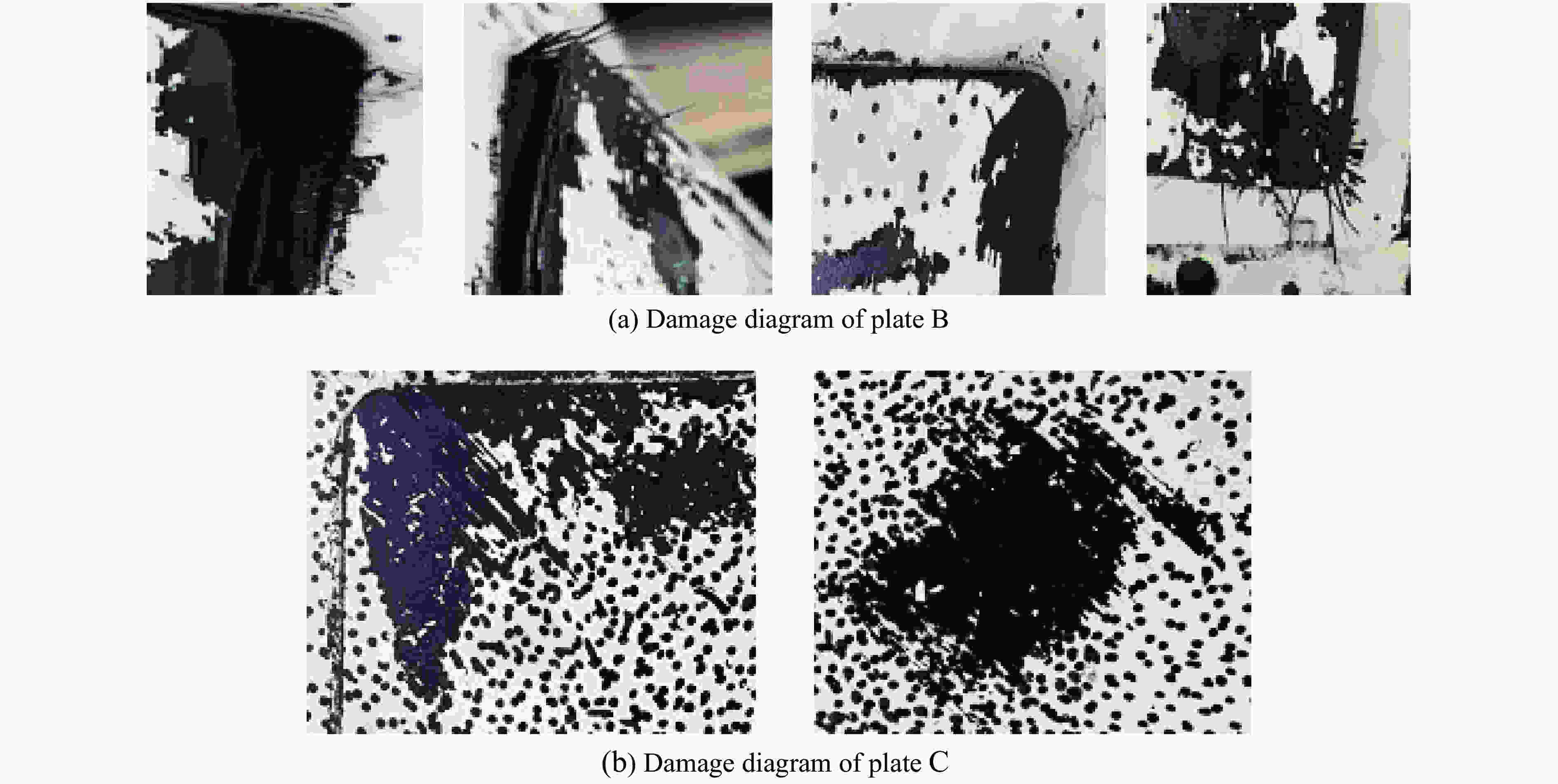Test No. Laminate type Explosive mass/g Explosion distance/mm 1 A 20 350 2 B 20 350 3 B 35 210 4 C 20 350 5 C 20 100 表 4 层合板宏观损伤情况