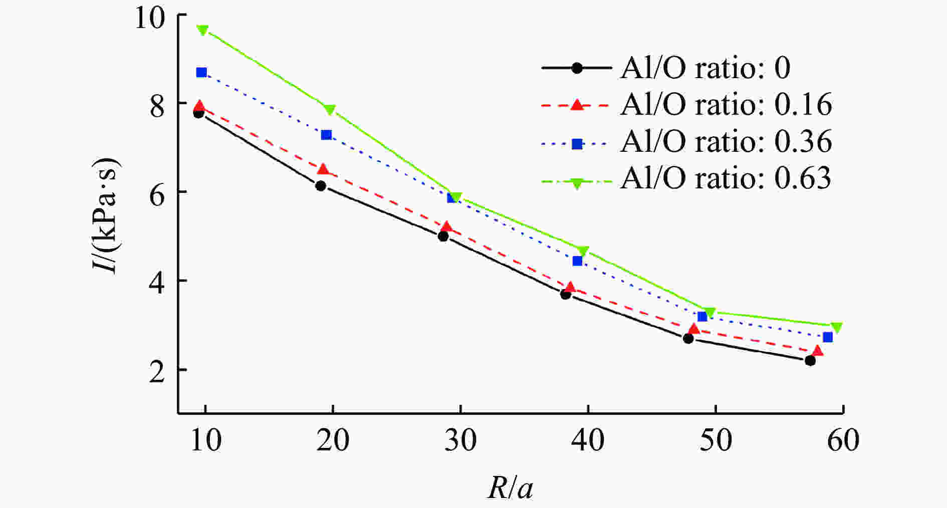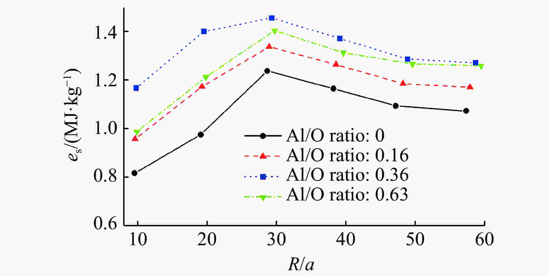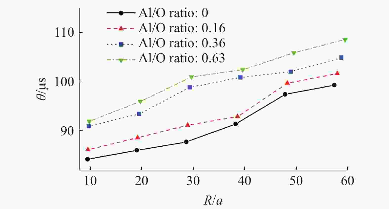 摘要: 为了系统地研究铝氧比对含铝炸药水下爆炸载荷及能量输出结构的影响,在验证数值模型有效性的基础上,针对铝氧比分别为0、0.16、0.36、0.63的RDX基含铝炸药,利用耦合欧拉-拉格朗日方法模拟了其水下爆炸连续的全过程,考虑了冲击波载荷和气泡载荷之间的耦合作用,从冲击波、气泡和能量输出结构三方面对影响效应进行评估。计算结果表明:随着铝氧比的增大,含铝炸药水下爆炸冲击波衰减时间常数、冲击波冲量、气泡脉动周期、气泡最大半径以及比气泡能都增大;铝氧比为0.36时,冲击波峰值压力、冲击波能流密度和比冲击波能达到最大。铝粉的加入对气泡能的提高相对于冲击波能更加显著。Abstract: In order to study the effect of Al/O ratio on underwater explosion load and energy output configuration of aluminized explosives systematically, four kinds of aluminized explosives are taken into account, and their Al/O ratio are 0, 0.16, 0.36 and 0.63, respectively. Coupled Eulerian-Lagrangian method was used to simulate the whole process of underwater explosion of four kinds of aluminized explosives on the basis of verifying the effectiveness of numerical method. The coupling effect between shock wave and bubble was considered in the numerical simulation. The impact effect is explained from three aspects: shock wave, bubble and energy output configuration. Simulation results show that with the increase of Al/O ratio, shock wave attenuation constant, shock wave impulse, bubble period, bubble maximum radius and specific bubble energy of underwater explosion of aluminized explosives all increase. Shock wave peak pressure, energy flow density and specific shock wave energy reach the maximum when Al/O ratio is 0.36. The addition of aluminum improves bubble energy more significantly than shock wave energy.