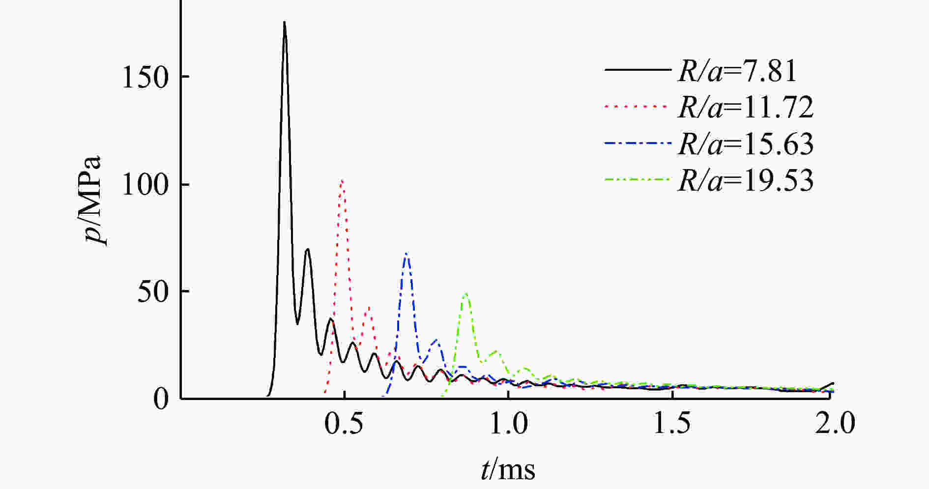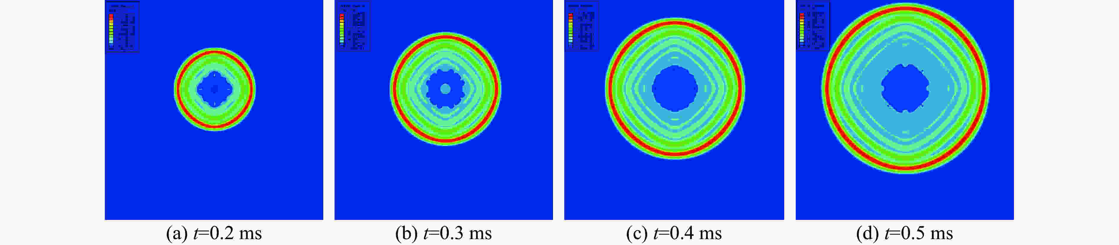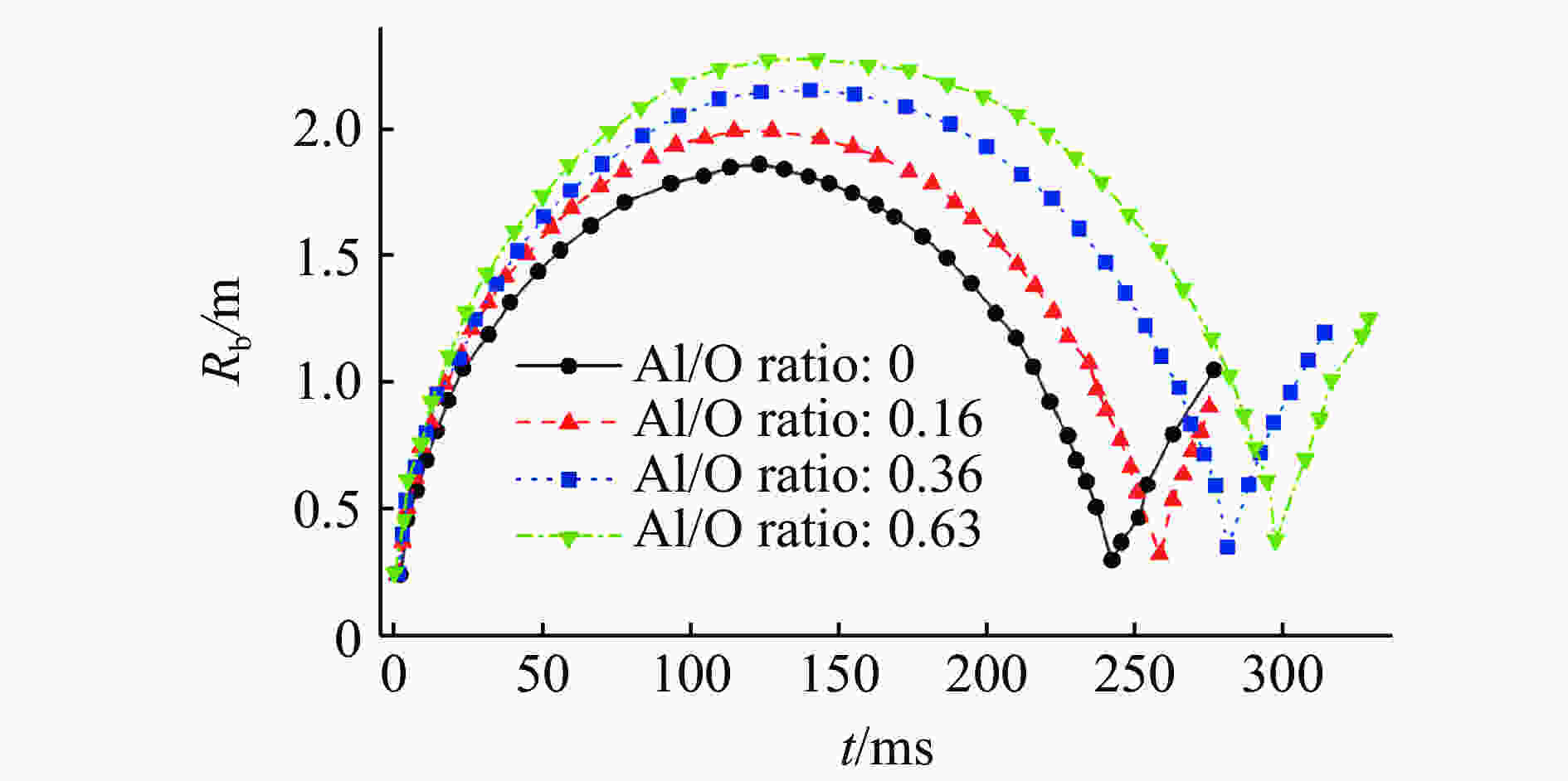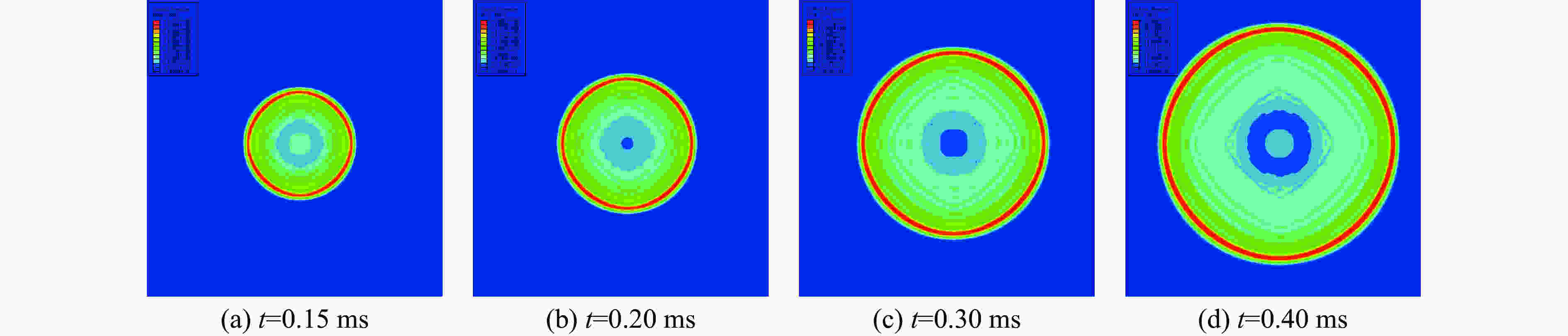 Sample $\rho $/(kg·m–3) A/GPa B/GPa R1 R2 ω e/(J·g–1) TNT 1 630 371.20 3.21 4.15 0.95 0.30 4 290 RS211 1 750 758.00 8.51 4.90 1.10 0.20 4 509 1(0) 1 667 334.77 9.50 6.71 1.26 0.21 5 636 2(0.16) 1 720 361.55 27.42 4.81 1.89 0.32 6 206 3(0.36) 1 788 709.60 20.27 5.37 1.90 0.34 6 956 4(0.63) 1 853 761.51 9.16 5.45 1.74 0.23 7 441 表 2 气泡周期和比气泡能的对比