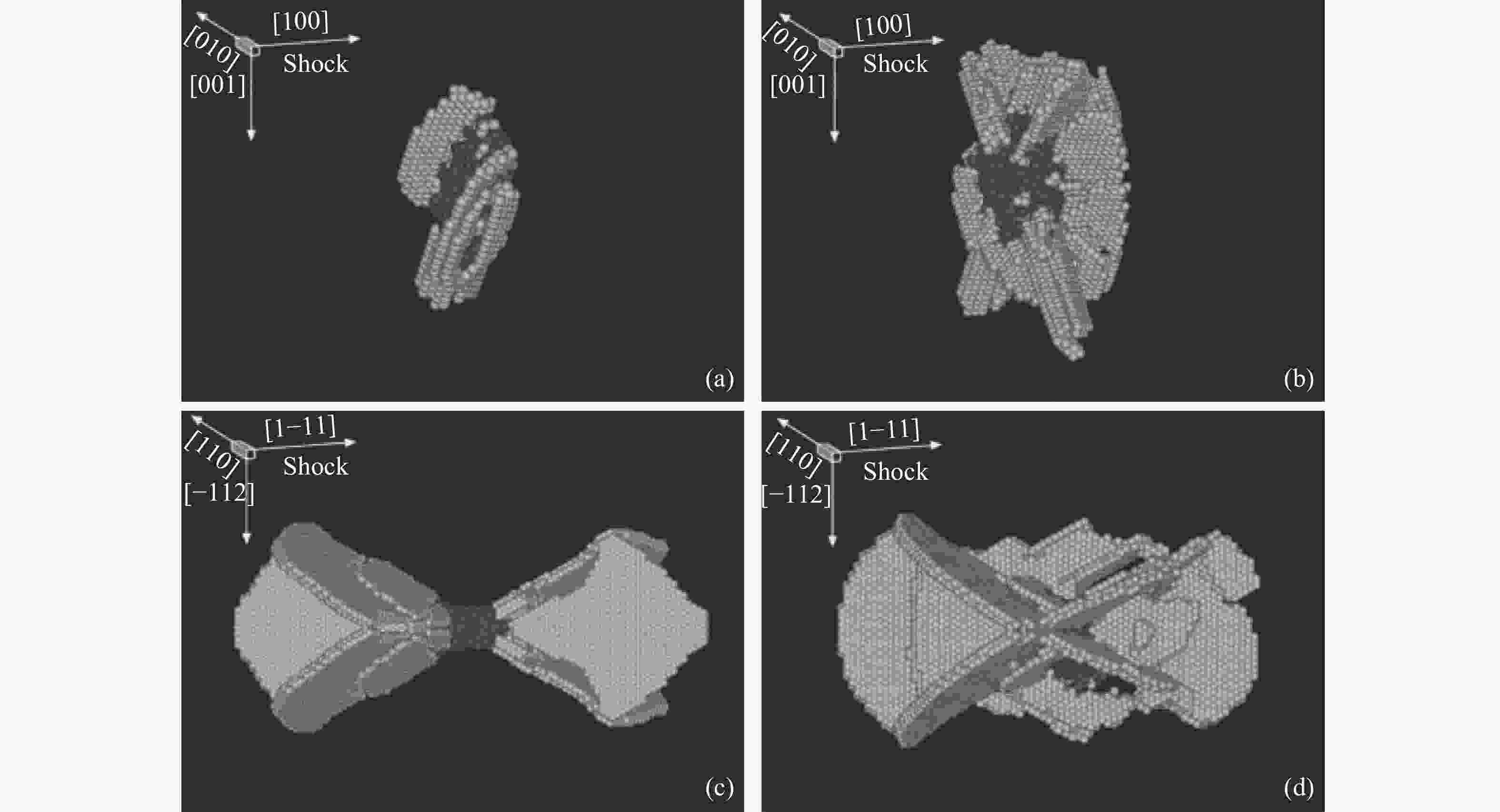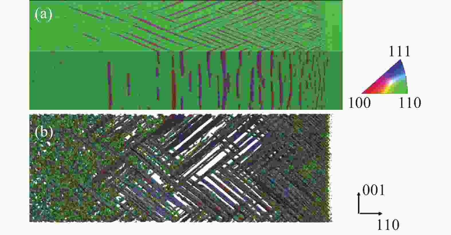 图 2 单晶Ta沿[110]冲击形成的变形孪晶图案[20]:(a)原子相对于冲击方向的取向着色,(b)仅显示非bcc原子